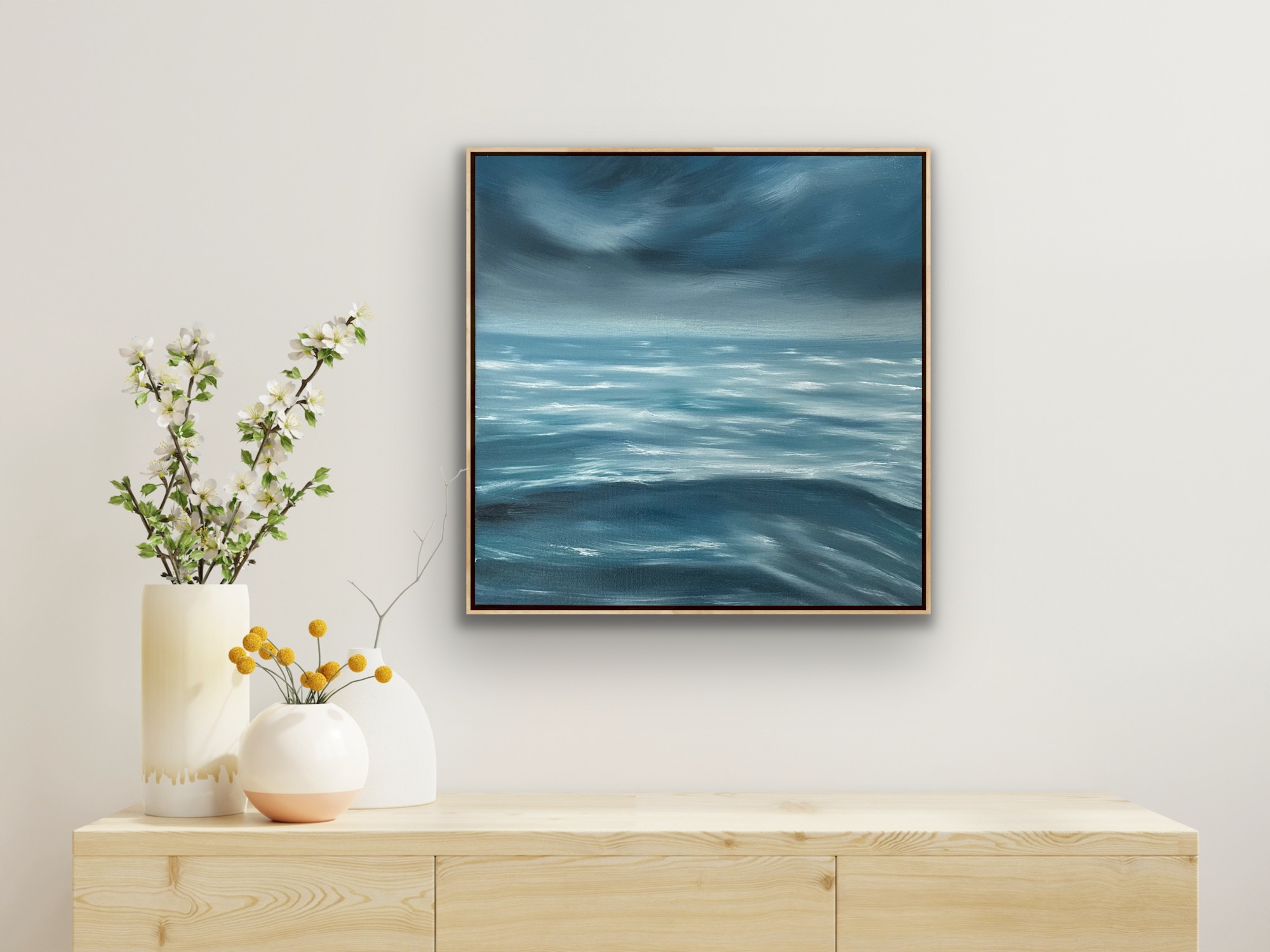 But how beautiful are storms to watch particularly over the water? I hope this painting brings that sensation to your space. Navy is a calming colour. The edges of this painting have been painted to ensure no exposed canvas is seen under the timber frame.