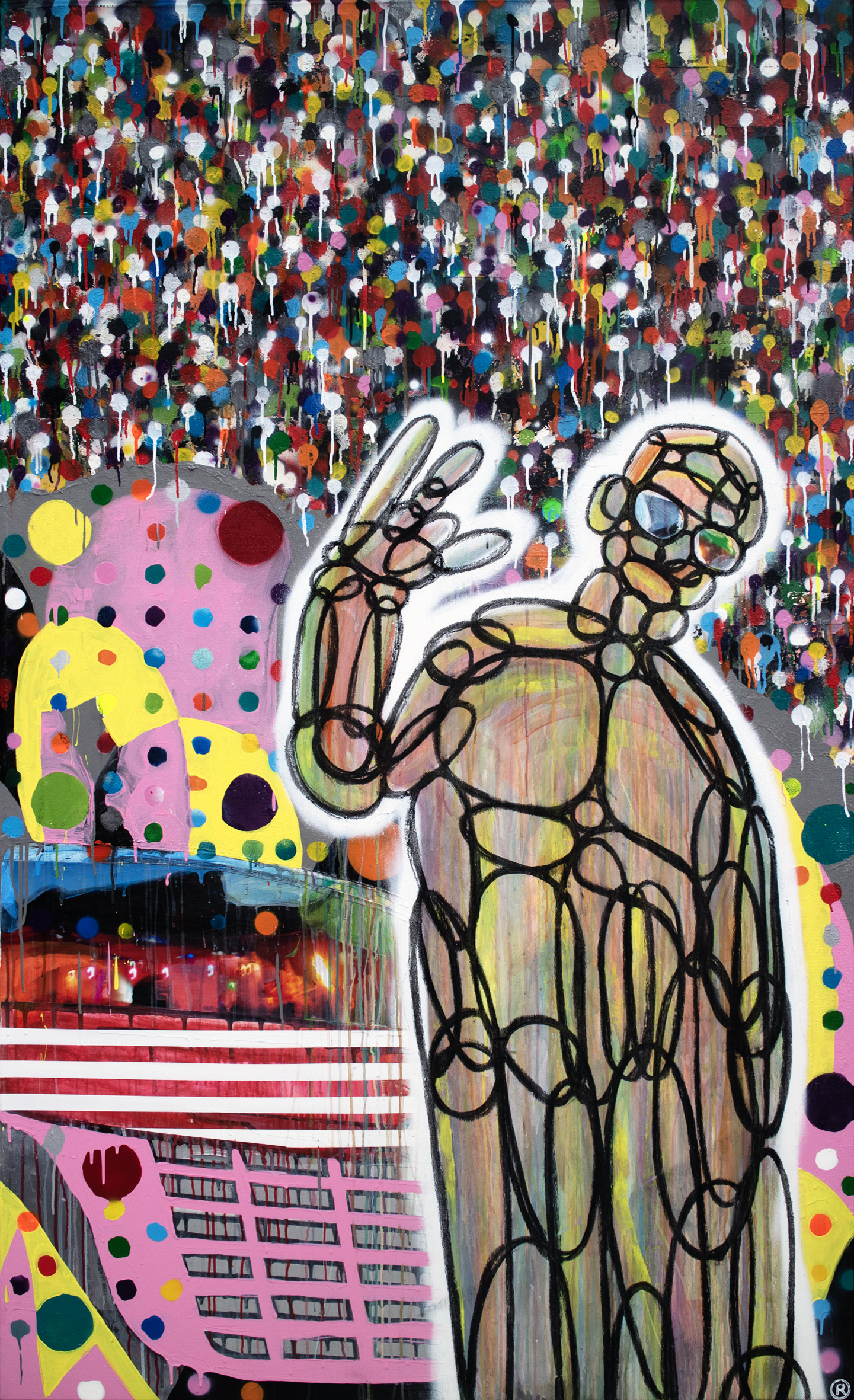 Mixed media – acrylic spray paint oil stick and collage on canvas