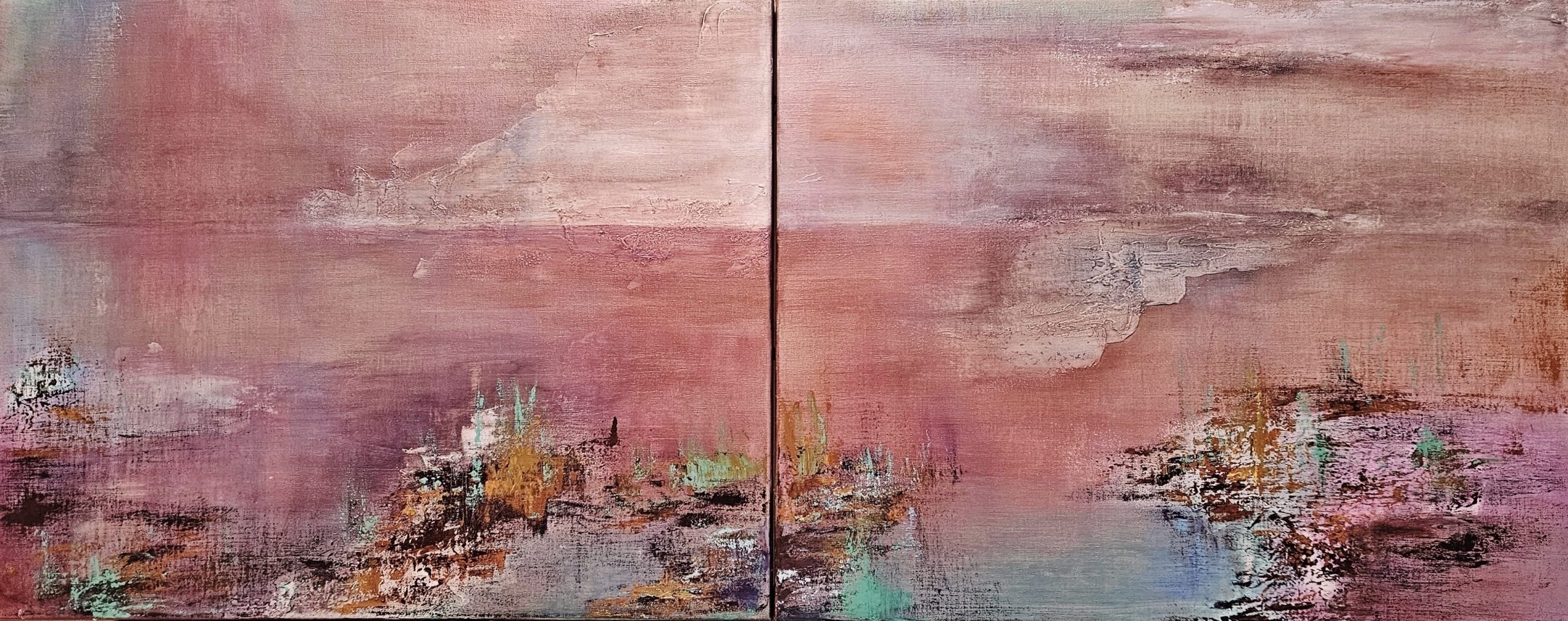 This impressionist painting was inspired by the Lake MacDonald where I often wander at the edge of the lake photographing birds. It is done with many acrylic layers and finished off with a palette knife for the foreground, It could be anywhere and has a calm and tranquil feel to it. The colours are very harmonious and it would suit any room. The two canvases are 75cm x 75cm each making up a lovely diptych of 150cm x 60cm.