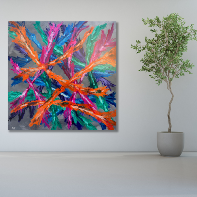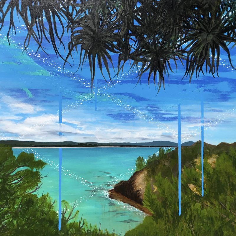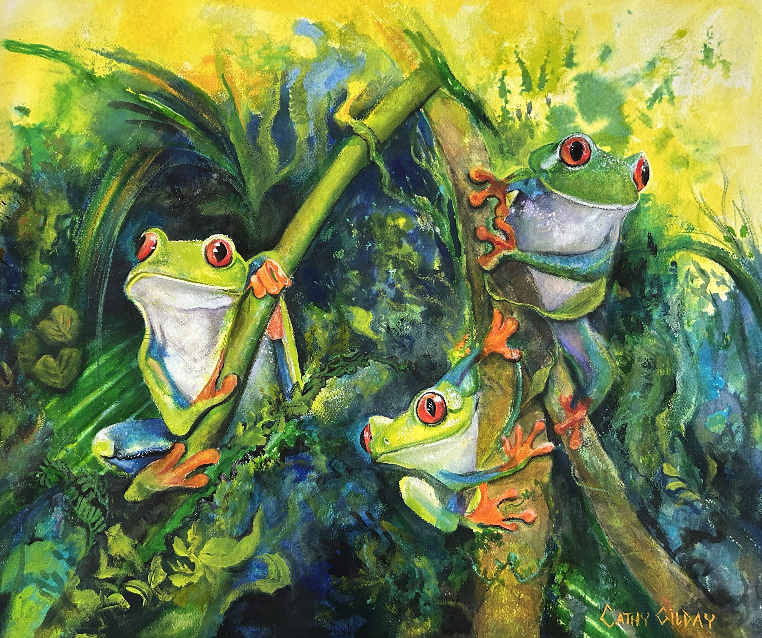 There’s something about red eyed tree frogs that make me smile. They have so much character and their little personalities seem to shine through. I have thoroughly enjoyed the process of creating this piece, beginning with a colourful ink background and then setting these three amigos in amongst the foliage. I have used artist quality inks and acrylics. The painting is sealed, requires framing.
