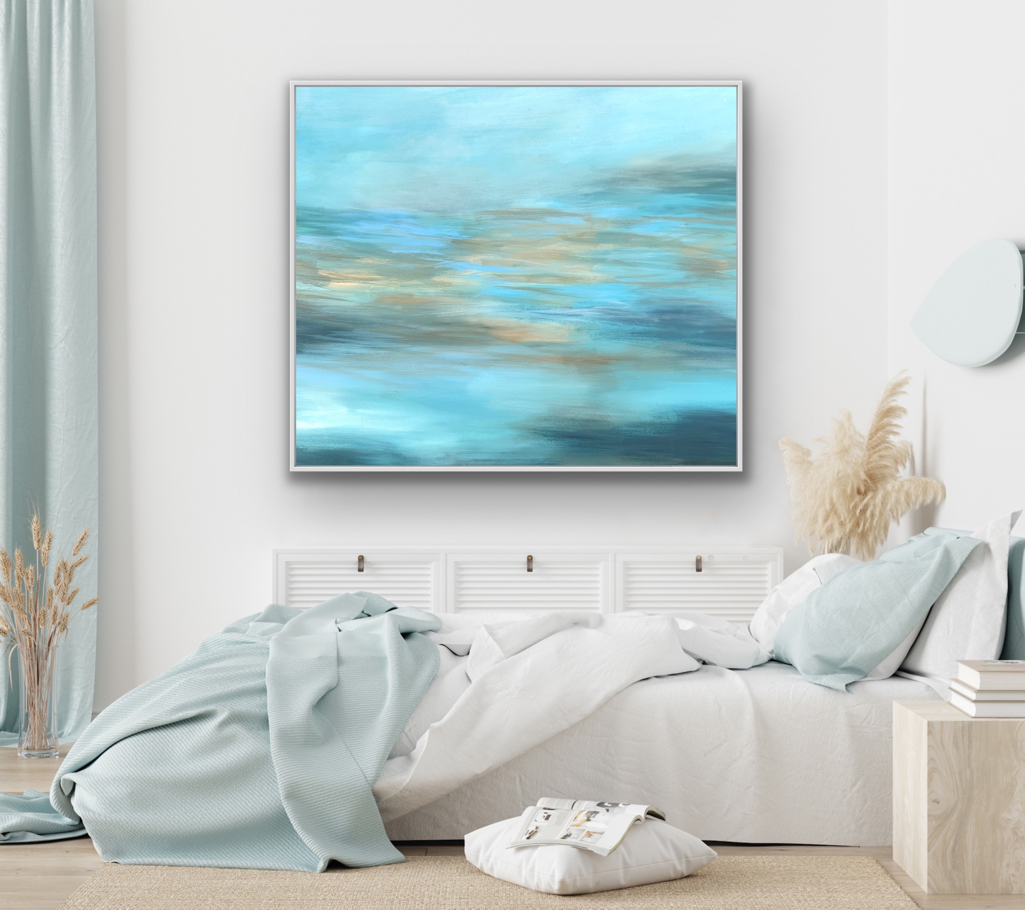 The tide is coming in by Theo Papathomas  is a painting celebrating blue colours and light. A very soothing and tranquil painting where sky, clouds, sea, water come together to create this beautiful harmonious landscape. Capturing the beautiful blue cool colours of the sea against the light colours of the sky. Clouds covering the sea .Painted in a very expressionistic way with lots of layers of paint. I tried to create so much depth in the painting .A very harmonious composition of colours and movement that makes it a very meditating and tranquil painting . The painting does not come with an external frame, and is signed and dated at the back and comes with a certificate of Authenticity.
