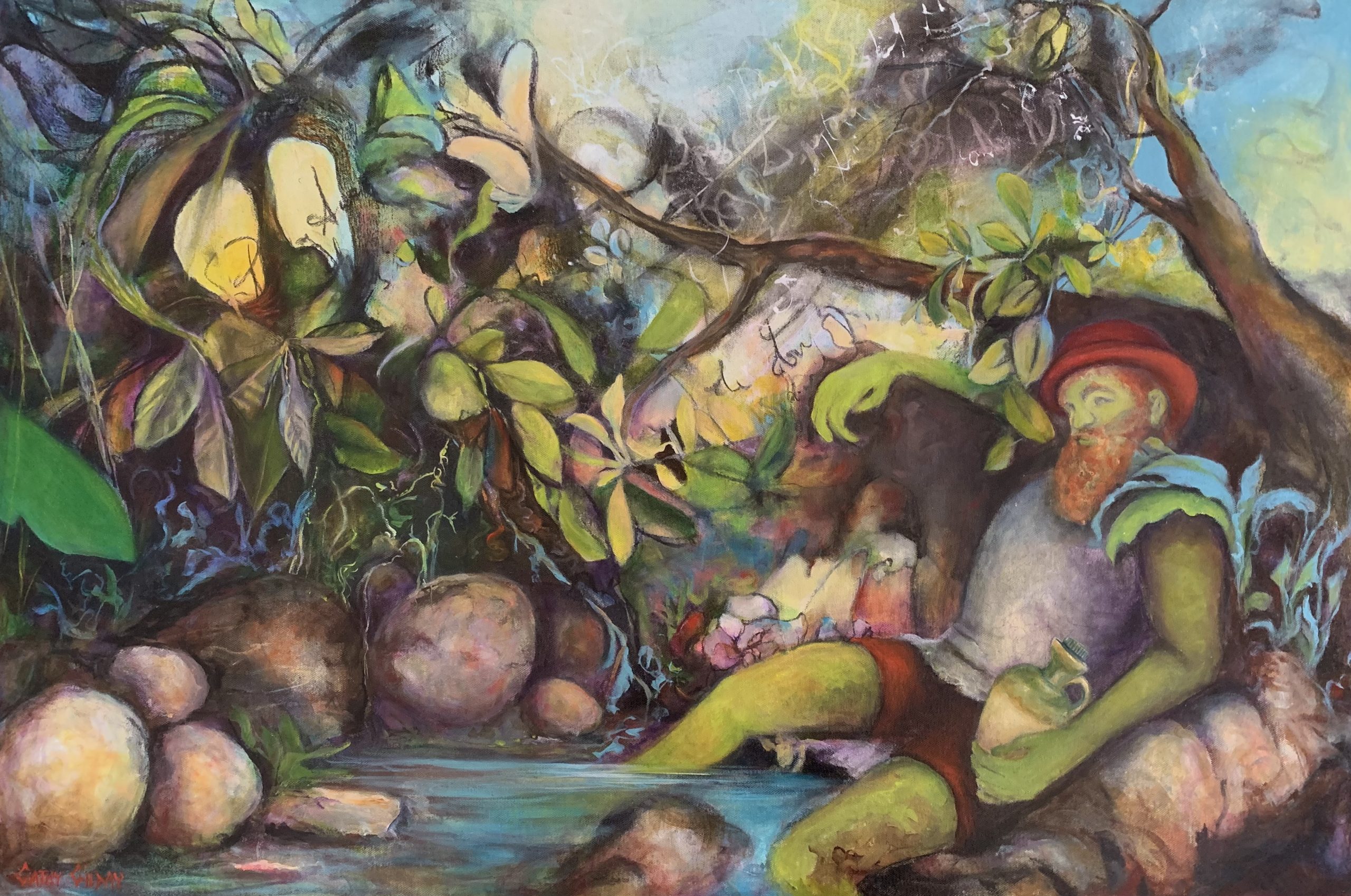 The Tipsy Traveller by Cathy Gilday – This story-telling artwork was such a wonderful journey. It began as an abstract, using charcoal and acrylic. Slowly, it developed into a botanical, fantasy landscape, with a rather tipsy character, resting his weary bones under a tree by a waterhole.