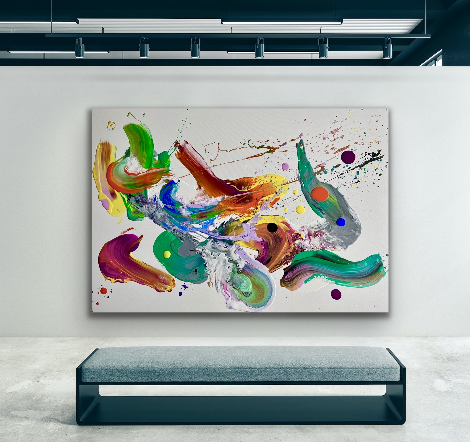 The Tortoise and The Hare by Jonathan Redmayne is a new body of work that delves into the world of abstract expressionism. The famous folktale theme in which ingenuity and are employed to overcome a stronger opponent. The account of a race between unequal partners, can you see the tortoise racing towards the finish line and the hare heading the opposite direction? The layers are carefully thoughtout and are applied with raw emotion, each colour fights for survival to achieve the desired effect. Action, speed and movement take centre stage, each unique piece is a page of my personal diary.