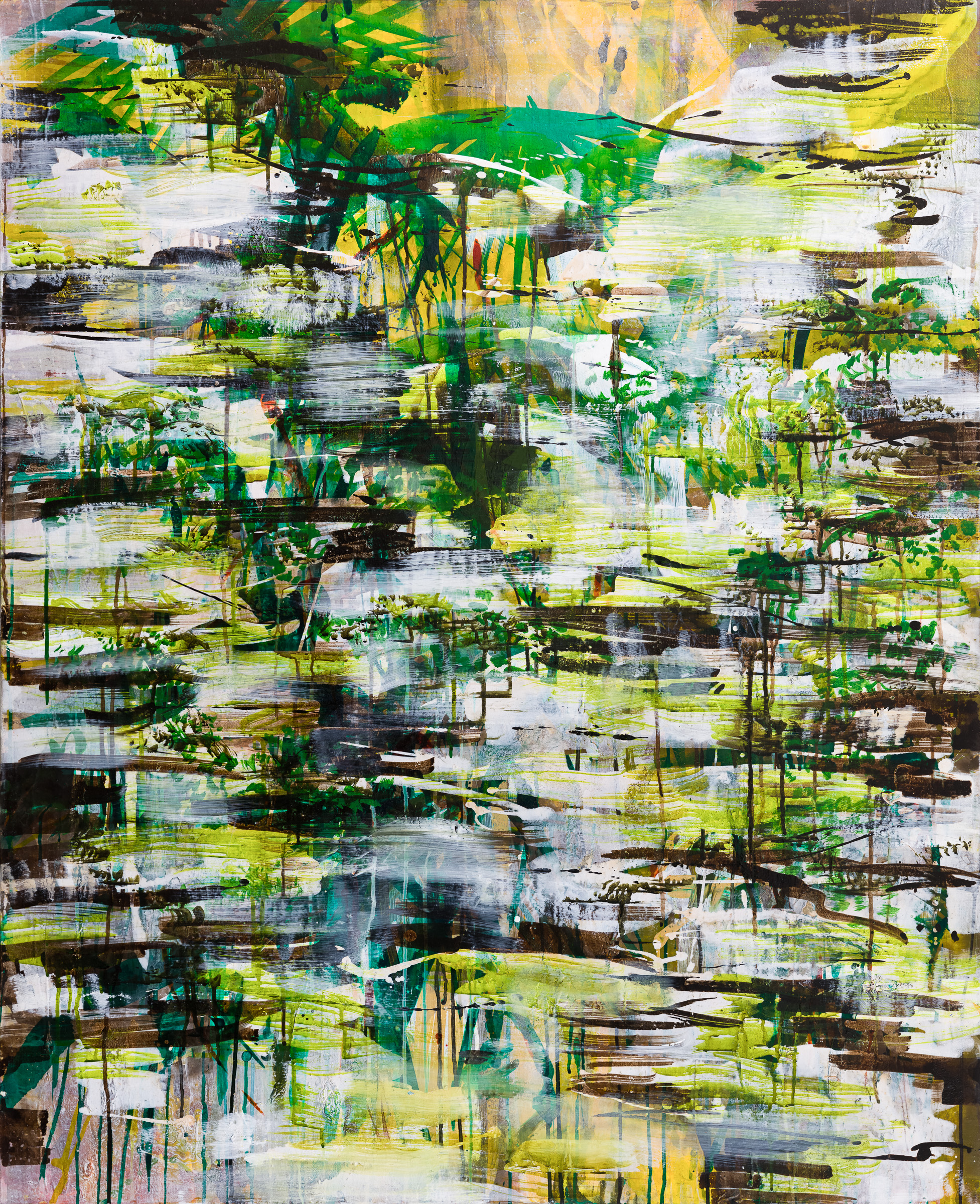 An original abstract artwork produced on quality canvas using ink and acrylics and stretched onto a hardwood stretcher bar. The inspiration behind this work which comes as individual work (or a set of 2 which work well together) or just as well individually. Both artworks capture the lush abundance found in the rainforest up the top end of Australia, in all of its glory. The impression of light dappling through palms fronds, expressive mark making capturing the liveliness and energy of this beautiful eco-system are to really share the vitality felt when experiencing it with the viewer.