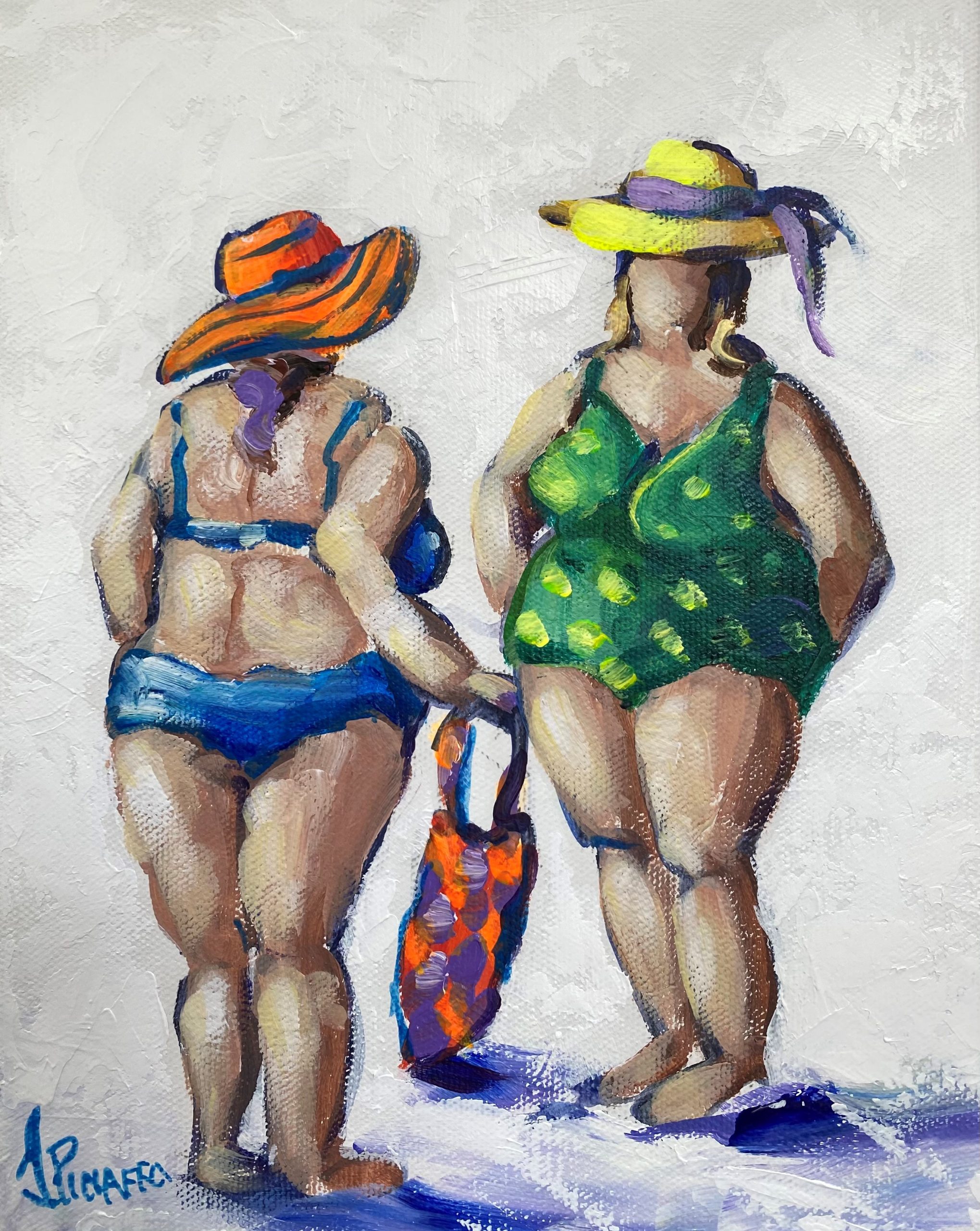This painting is #4 of “the two of us” quirky ladies at the beach. Created from my imagination.