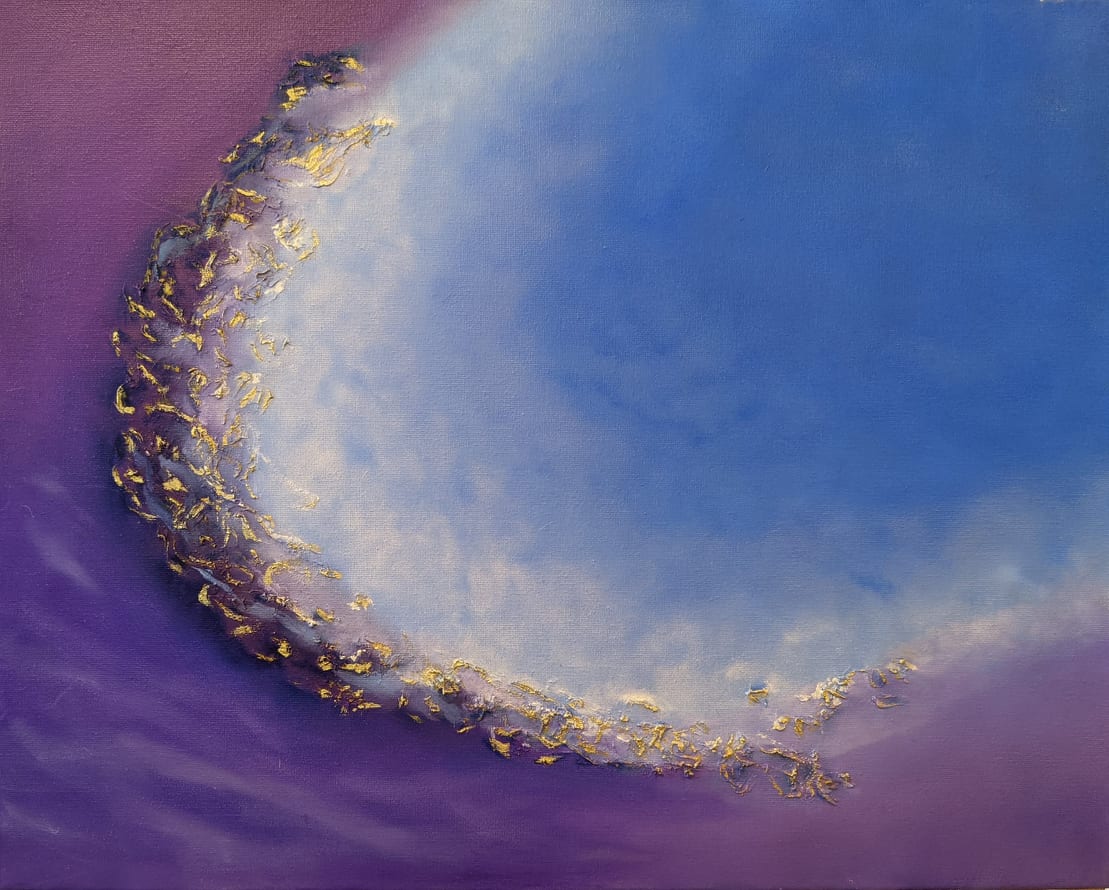 This is an abstract oil painting. The highlights are done with a special real metal paint in golden colour. The base layer is done in modelling paste, so you can see and feel the texture. The edges are painted black, it’s ready to be displayed. Signed on the back.