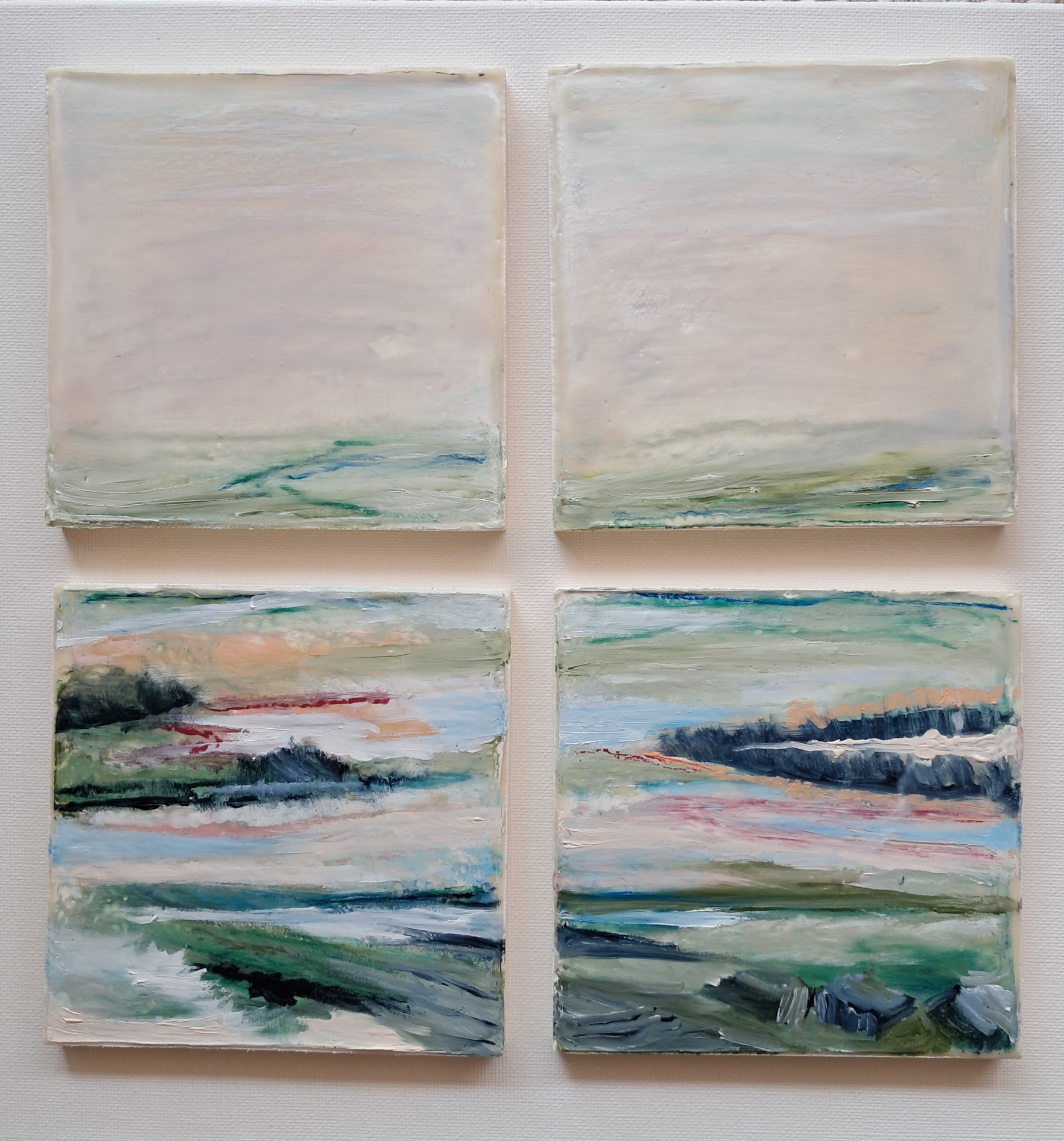 Oil and encaustic wax for texture, depth and vibrancy. 4 paintings – each painting is 12cm x 12cm, together measure 24cm x 24cm – unframed.