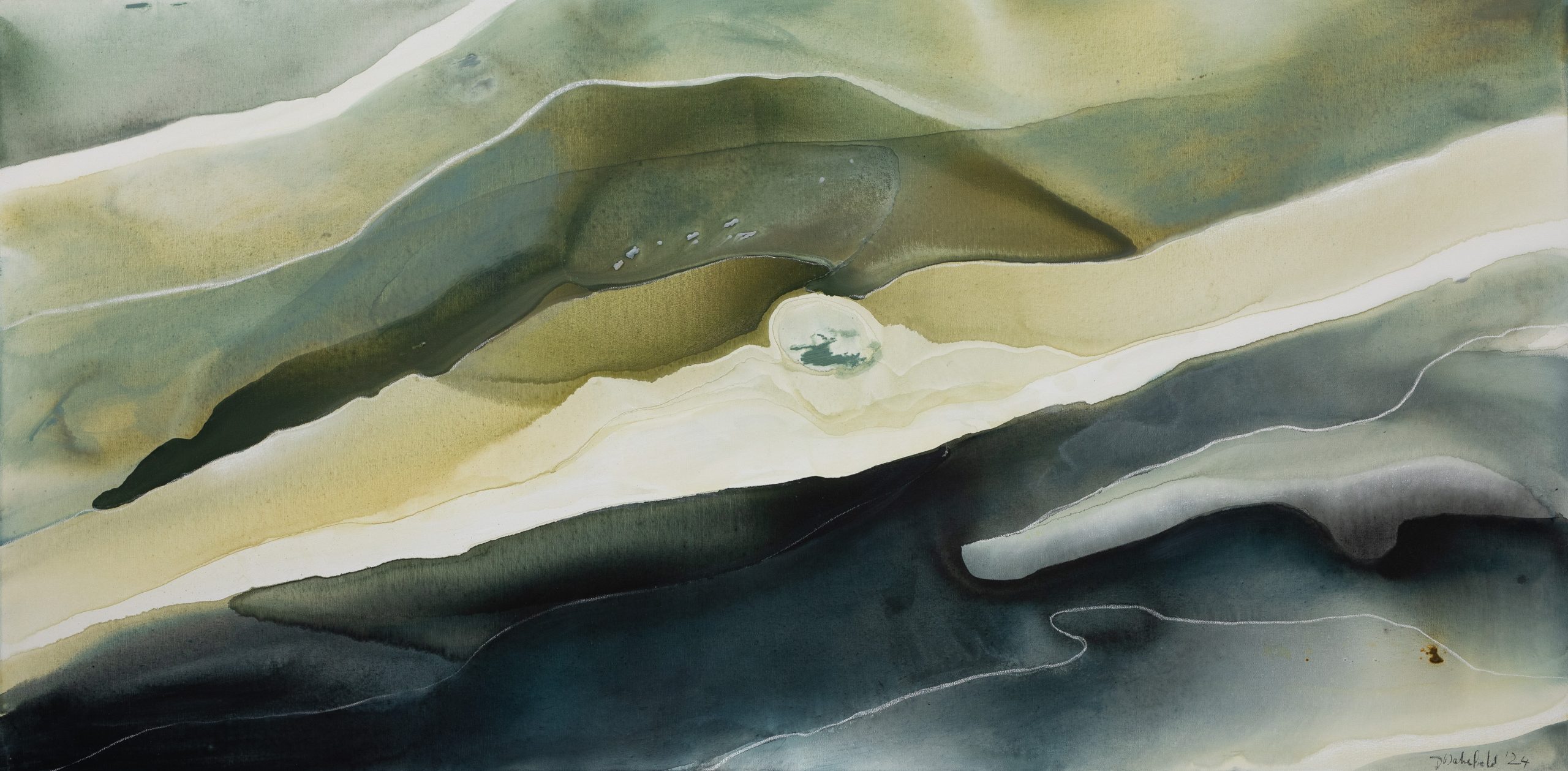 The Valley Beyond by Dinah Wakefield is inspired by the light, the colours and the natural beauty of the Noosa region of Australia. “What I love most about Noosa is the interplay of light. From the oceans to the clouds, to the river estuaries and the hinterland, this canvas unfolds before me every day and finds expression in my paintings”.