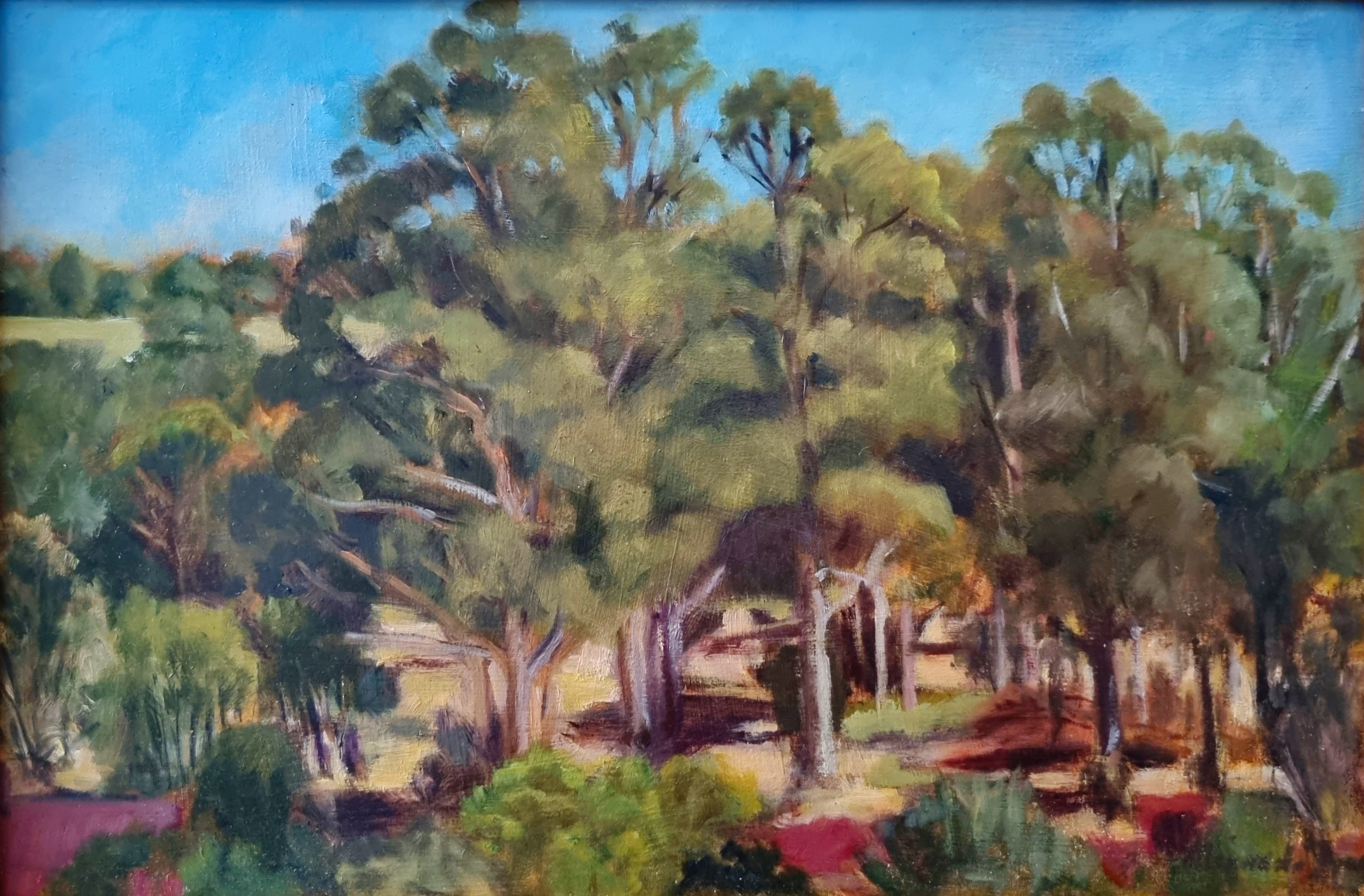 This work is of the view from my home in a small town in the south west of WA across to a children’s playground that is shaded by a beautiful stand of trees. In an episode of the Colour in Your Life TV show about me and my art you can see me painting this work.