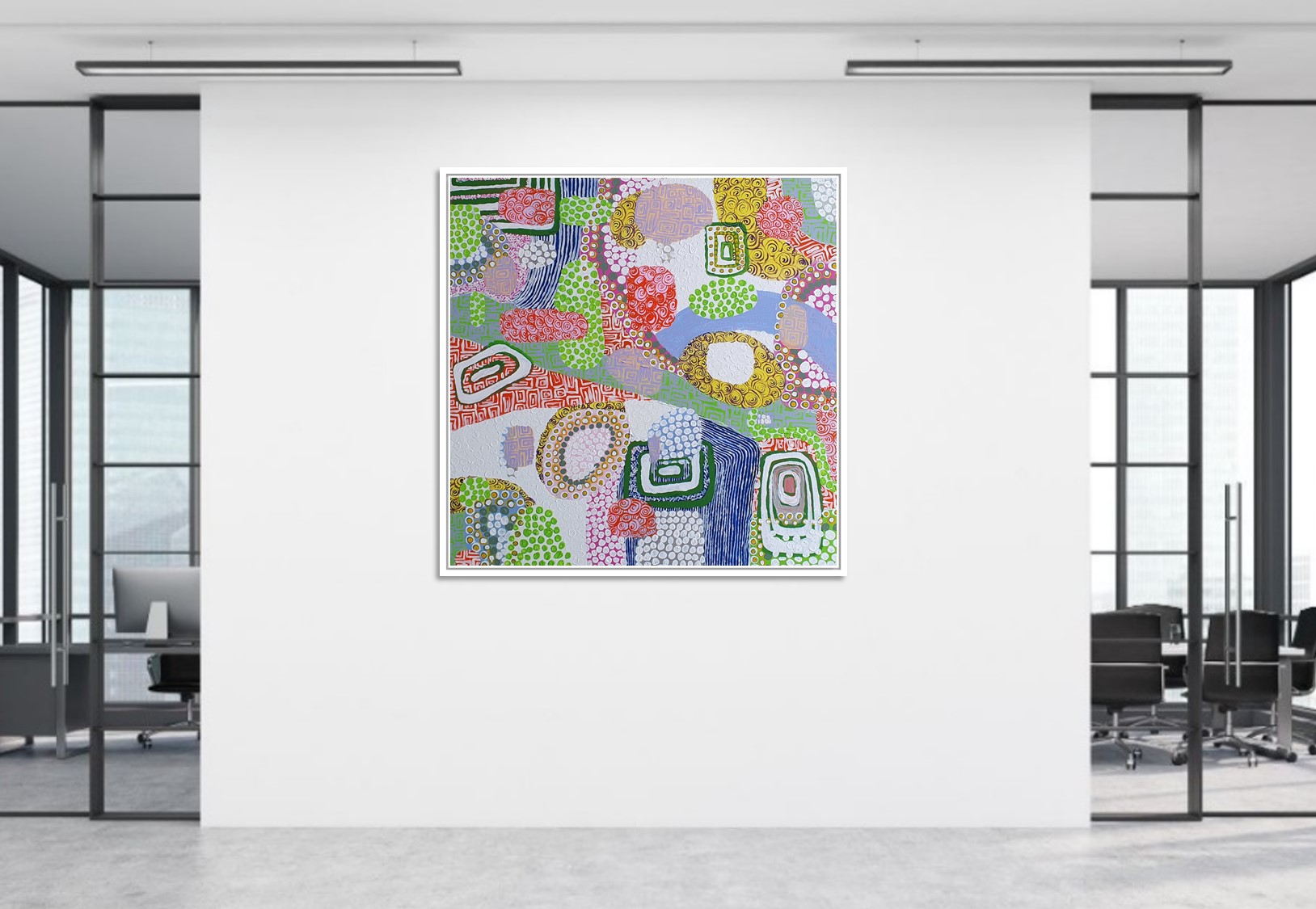 Inspired by aerial views of garden landscapes and my own garden, a mixture of garden beds full of vibrant coloured flowers, vegetables and herbs, the crisscross pathways and rock terraces.