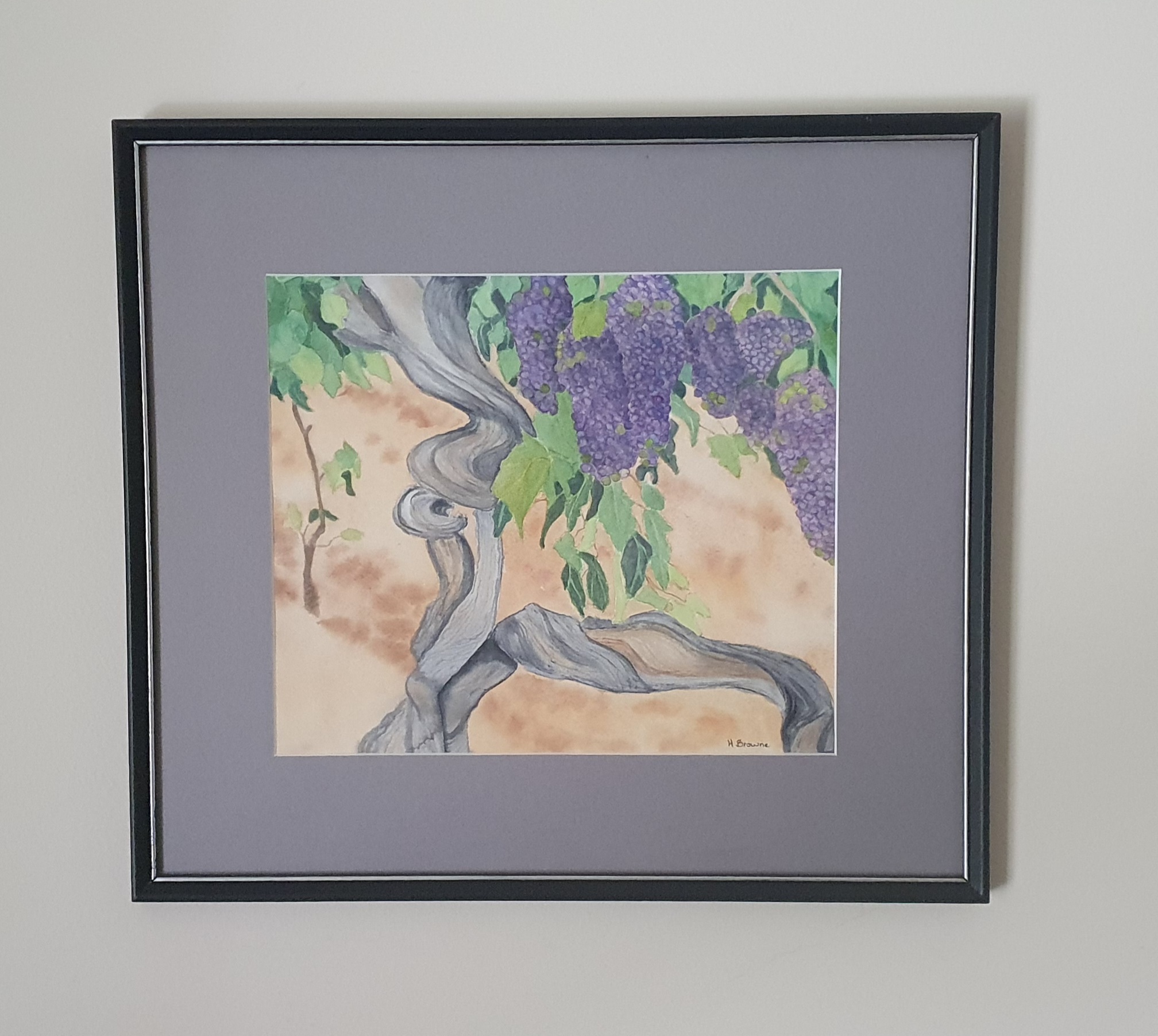This painting is framed with a grey mount behind glass to complement the grey of the aged twisted vine and is ready to hang.