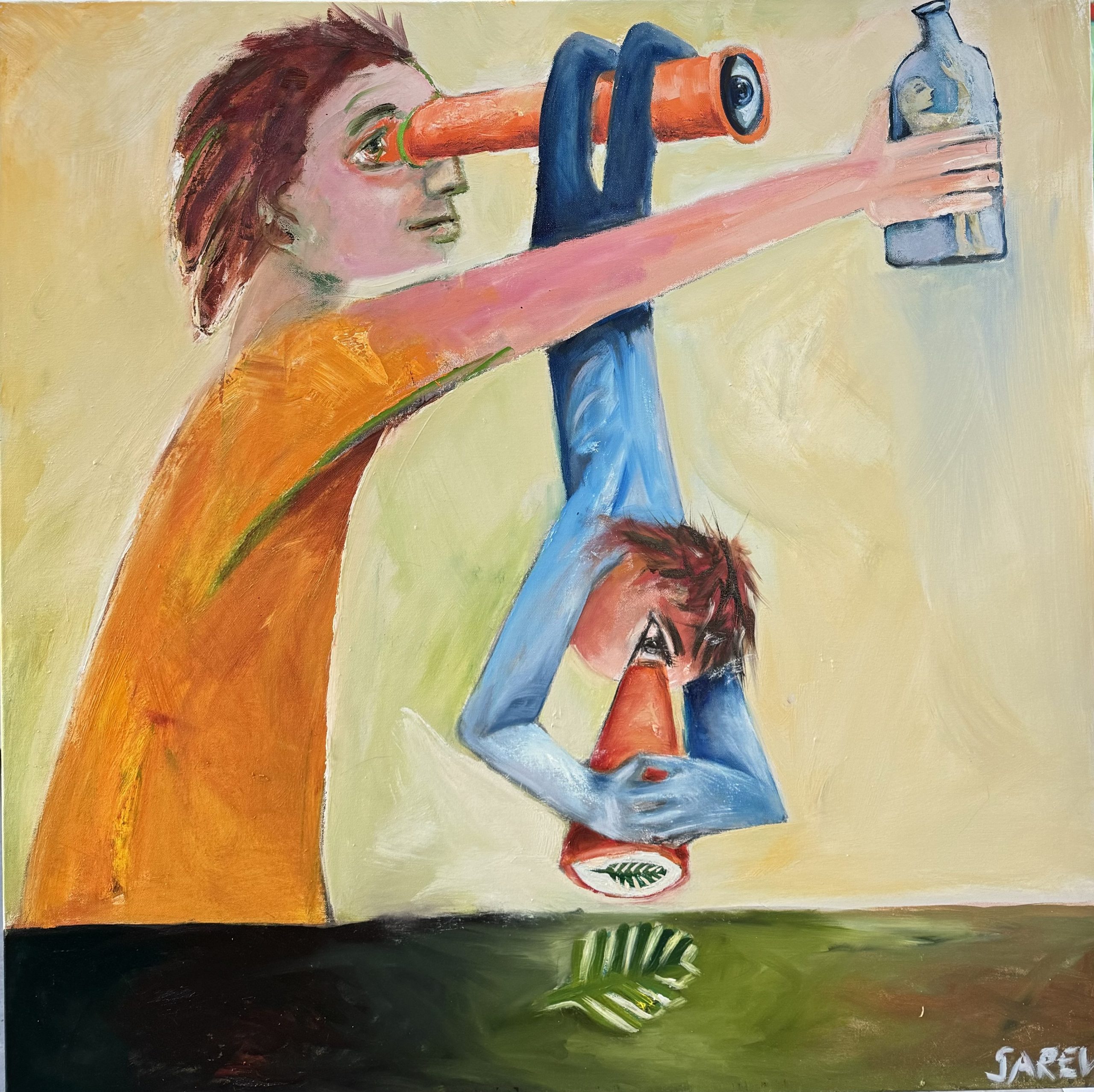 The two figures are engaged in a dialogue which explores how we can engage with our world. The painting is about looking, and offers a playful exploration into whether we are oblivious to our being contained by our beliefs or others or free to explore our true nature.