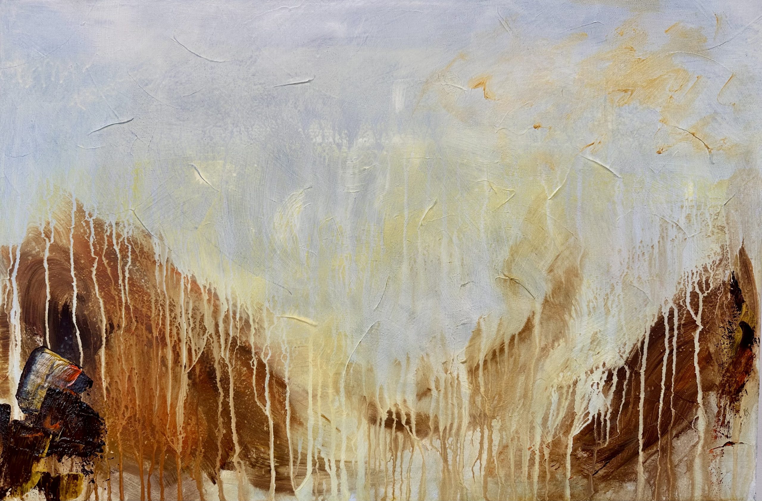 This painting is an abstract landscape inspired by the earthy shades of warm sienna and flourishes of gold.