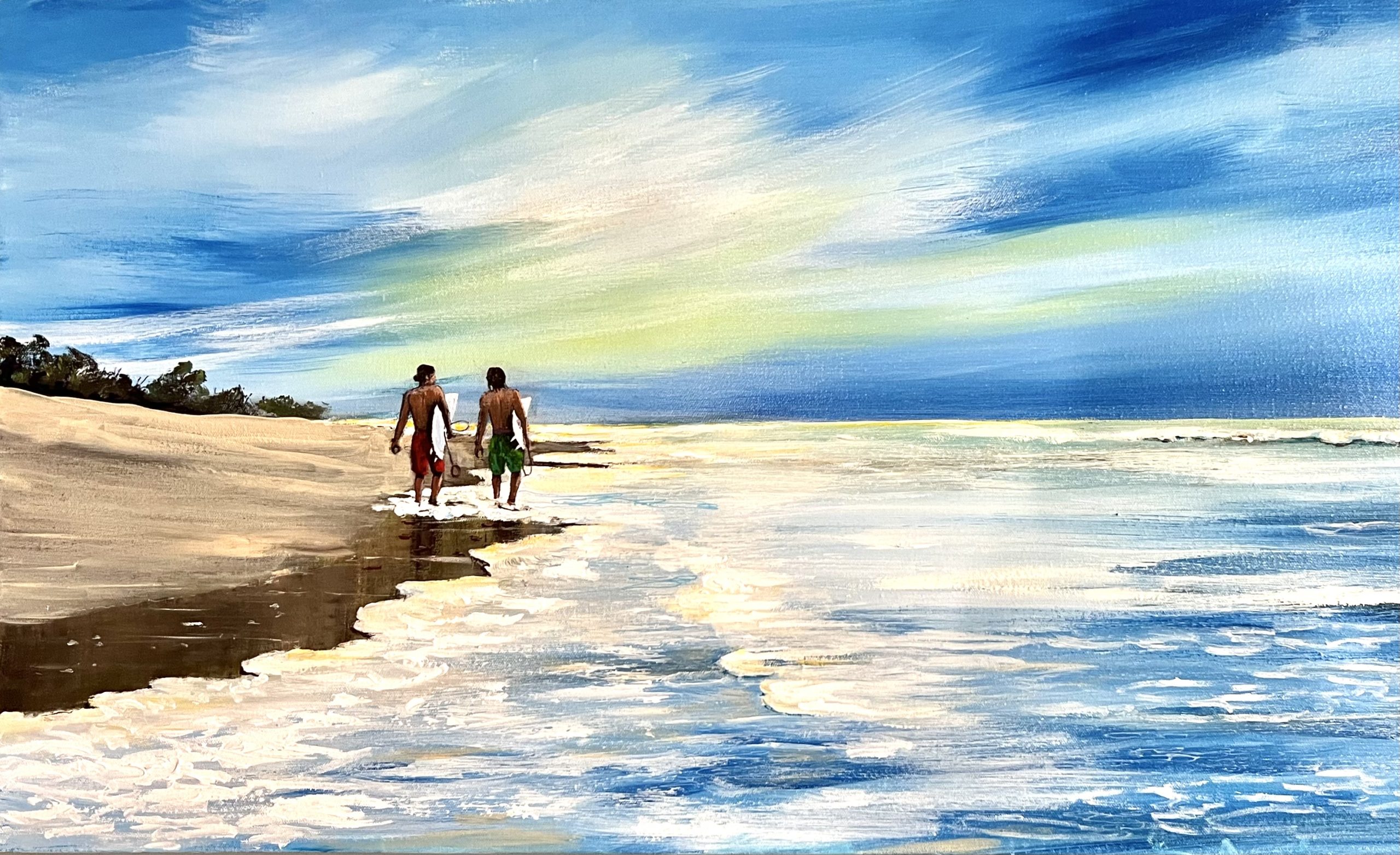 Original. Acrylic, on stretched canvas. The surfers walking oin the beach on their way home after a great day surfing. Protective clear coats – Hooks and wire across back. on quality stretched canvas.
