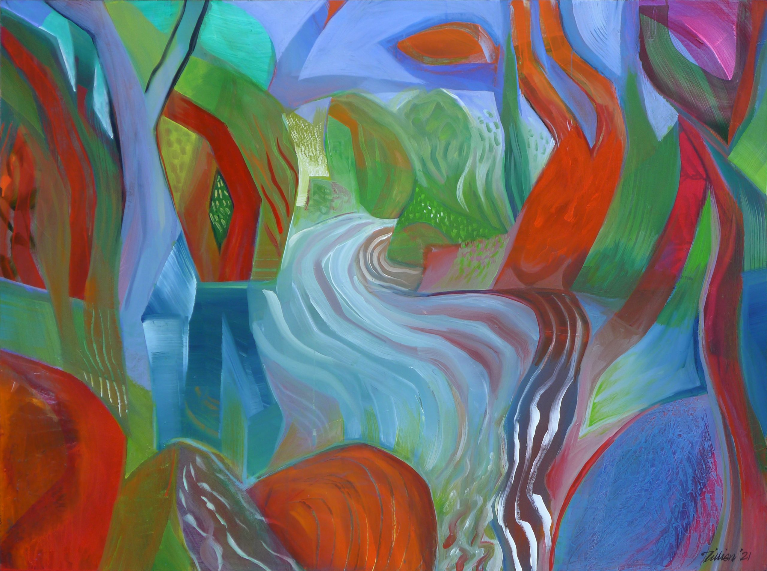 A river of light flows through abstract terrain in this visionary landscape. Layered forms—part forest, part memory—evoke a dreamlike passage through colour, gesture, and mood. The title suggests a sacred or psychic distance: these waters may be longed for, but not possessed. The painting’s sinuous central current, rendered in gliding strokes of aquamarine, lavender, and white, leads the eye into a spectral corridor of unfixed time and space. The brushwork evokes motion, memory, and the threshold state between perception and revelation.