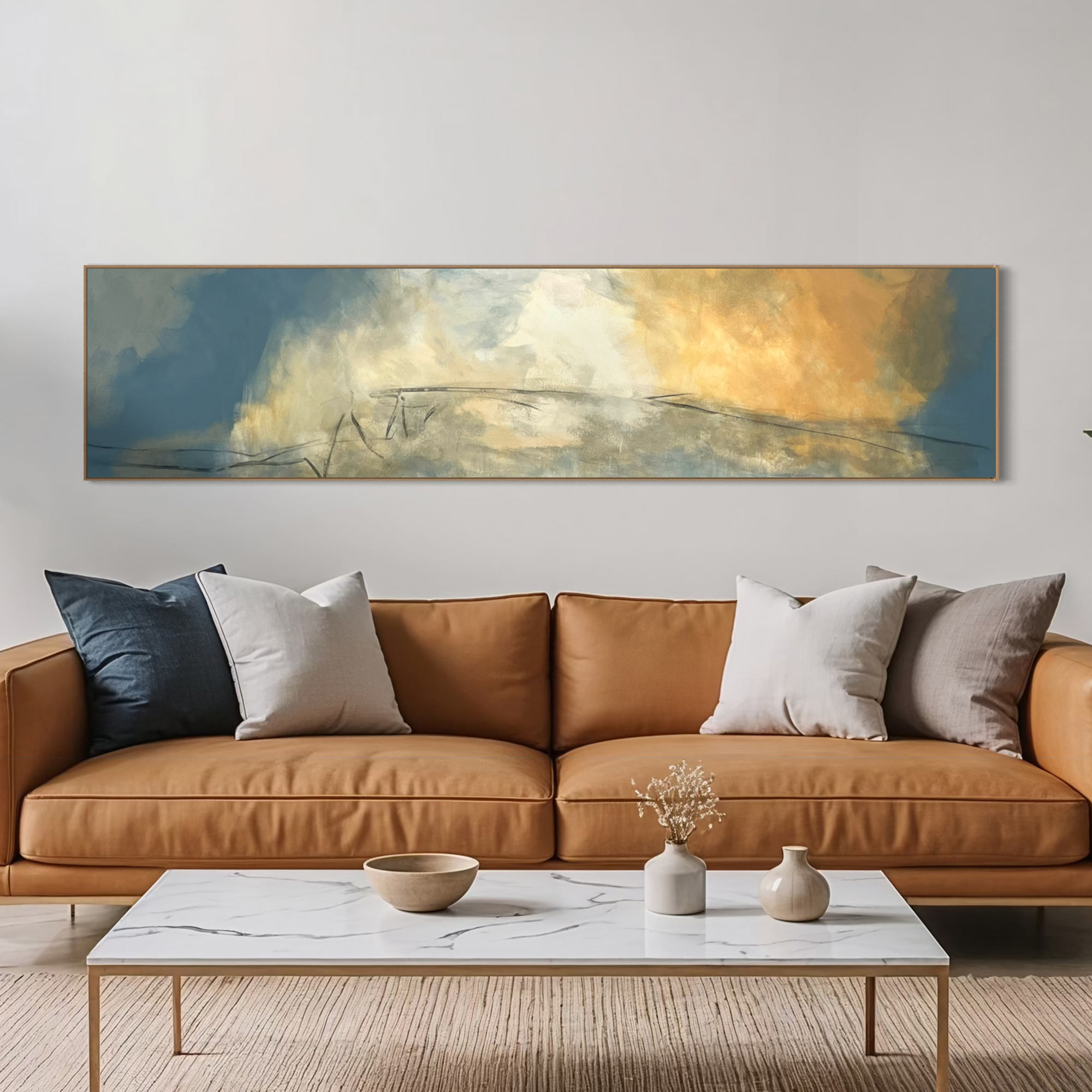 This striking statement piece combines energetic mark making with a a stunning palette of white, beige and soft ochre, blended with areas of peaceful greeny blues, ash black and cool grey lead pencil line work.