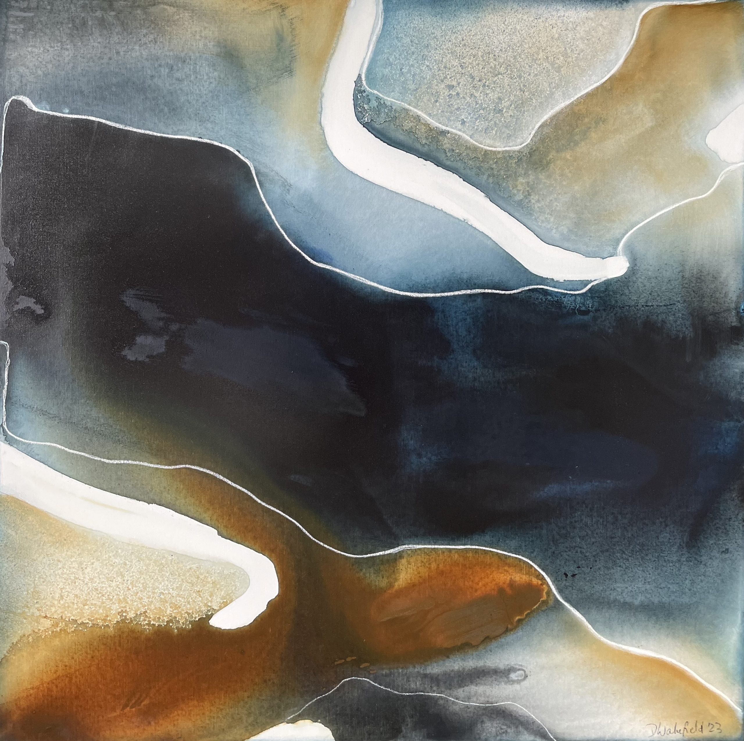 The Way of Water 1 by Dinah Wakefield is inspired by the light, the colours and the natural beauty of the Noosa region of Australia. “What I love most about Noosa is the interplay of light. From the oceans to the clouds, to the river estuaries and the hinterland, this canvas unfolds before me every day and finds expression in my paintings”.