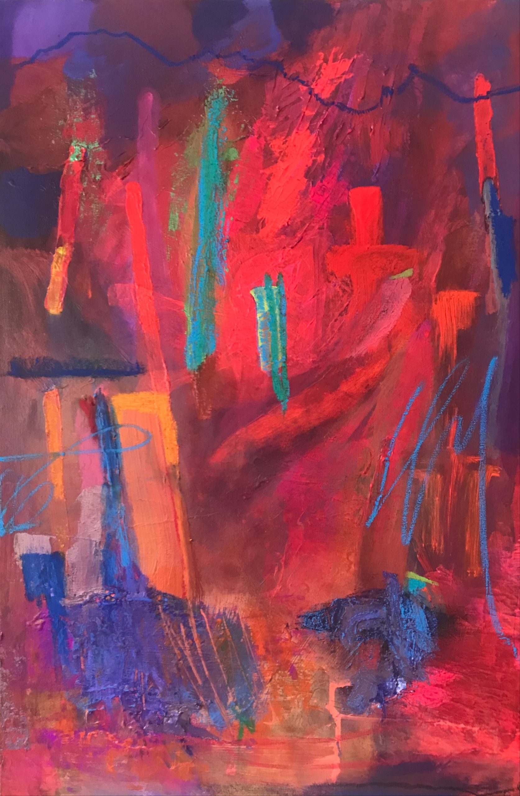 The way we were by Ian Burgess – This painting satisfies my cravings for colour and my favoured palette of red, orange and purple with green and blue accents finished with intuitive marks of oil pastels.