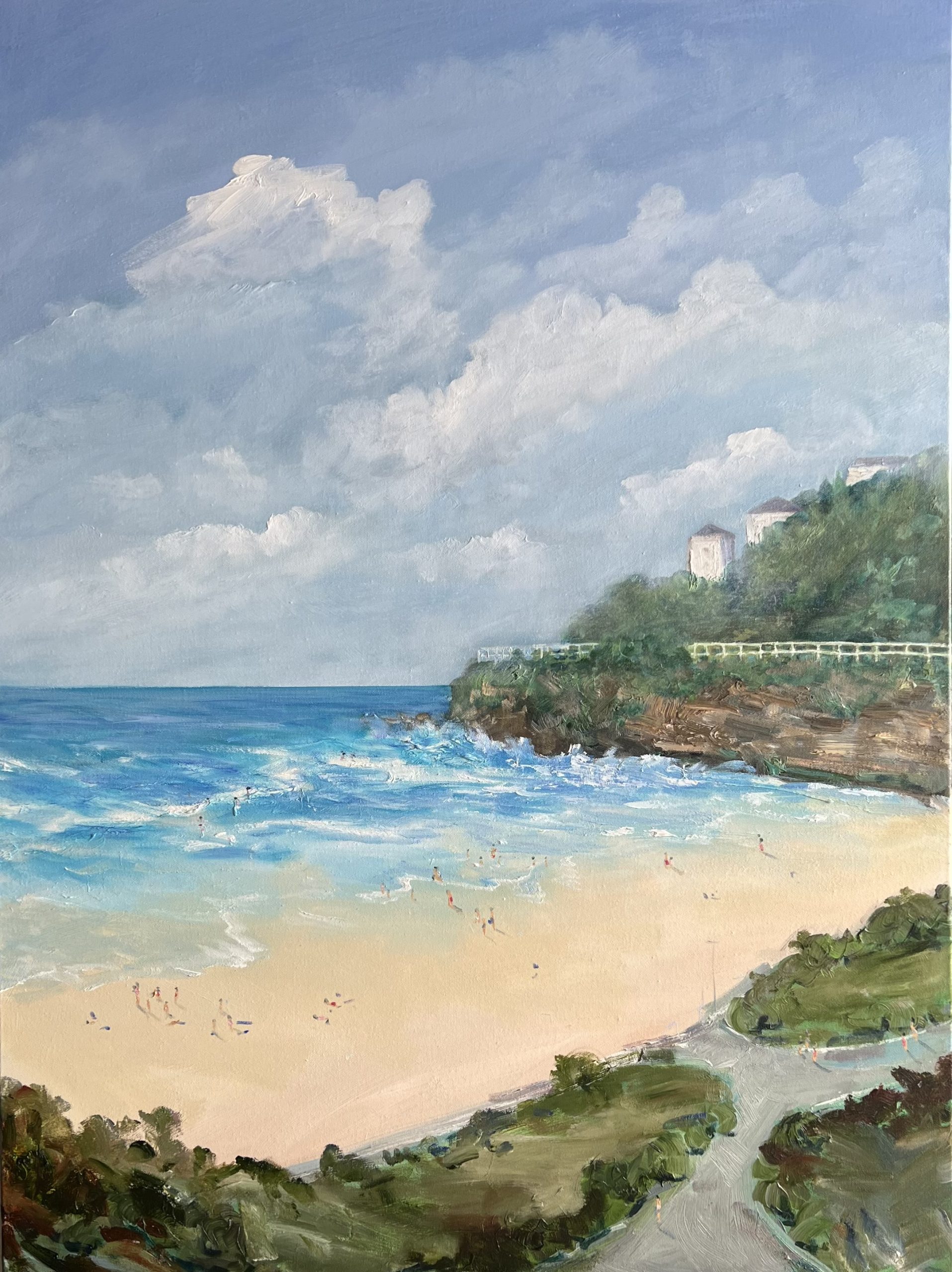 A moody sky with energetic brush work. Turquoise waves and Sydney’s legendary sandstone cliffs.