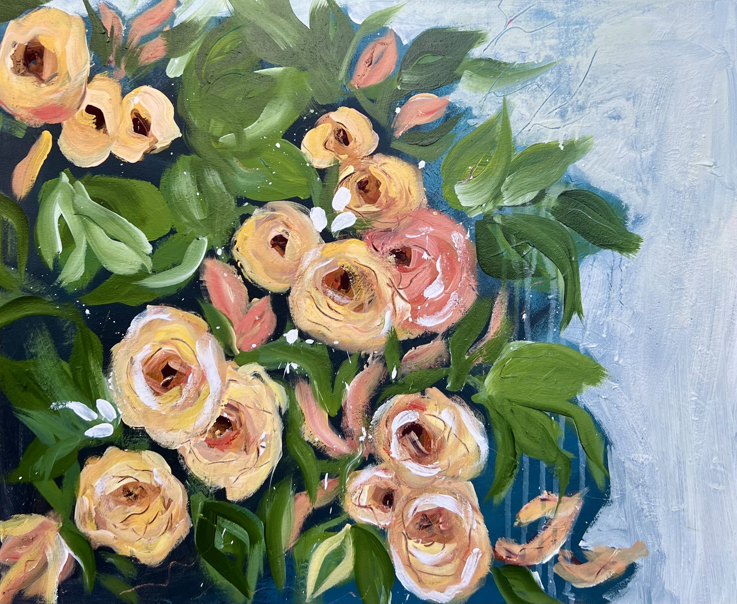 This piece is a part of my 2025 floral series. Beautifully placed against a wet/rainy background, the gorgeous yellow bunch in my son’s room inspired me to paint it.
