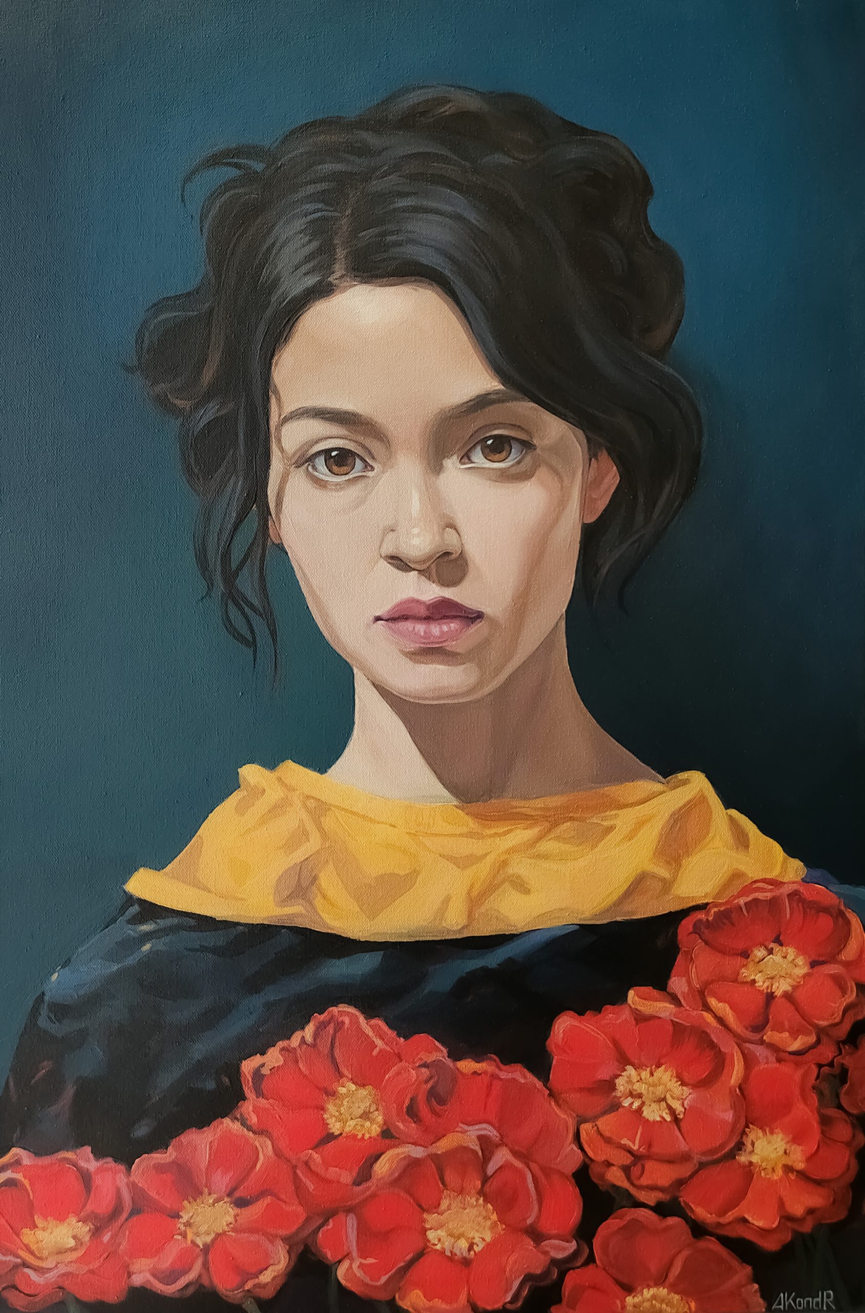 As you gaze upon this painting, you are immersed in the story of a mysterious young woman whose hazel eyes appear almost golden, as if she embodies a golden era. She stands before you, framed by a background of deep blue, reminiscent of the color of ocean waves, harmoniously contrasting with her dark dress and vivid yellow collar, which is like a sunbeam in this ocean of colors. The young woman holds a bouquet of poppies, symbolizing not only beauty but also strength and passion. Her gaze seems to draw you in as if she knows much and can tell us about her adventures.