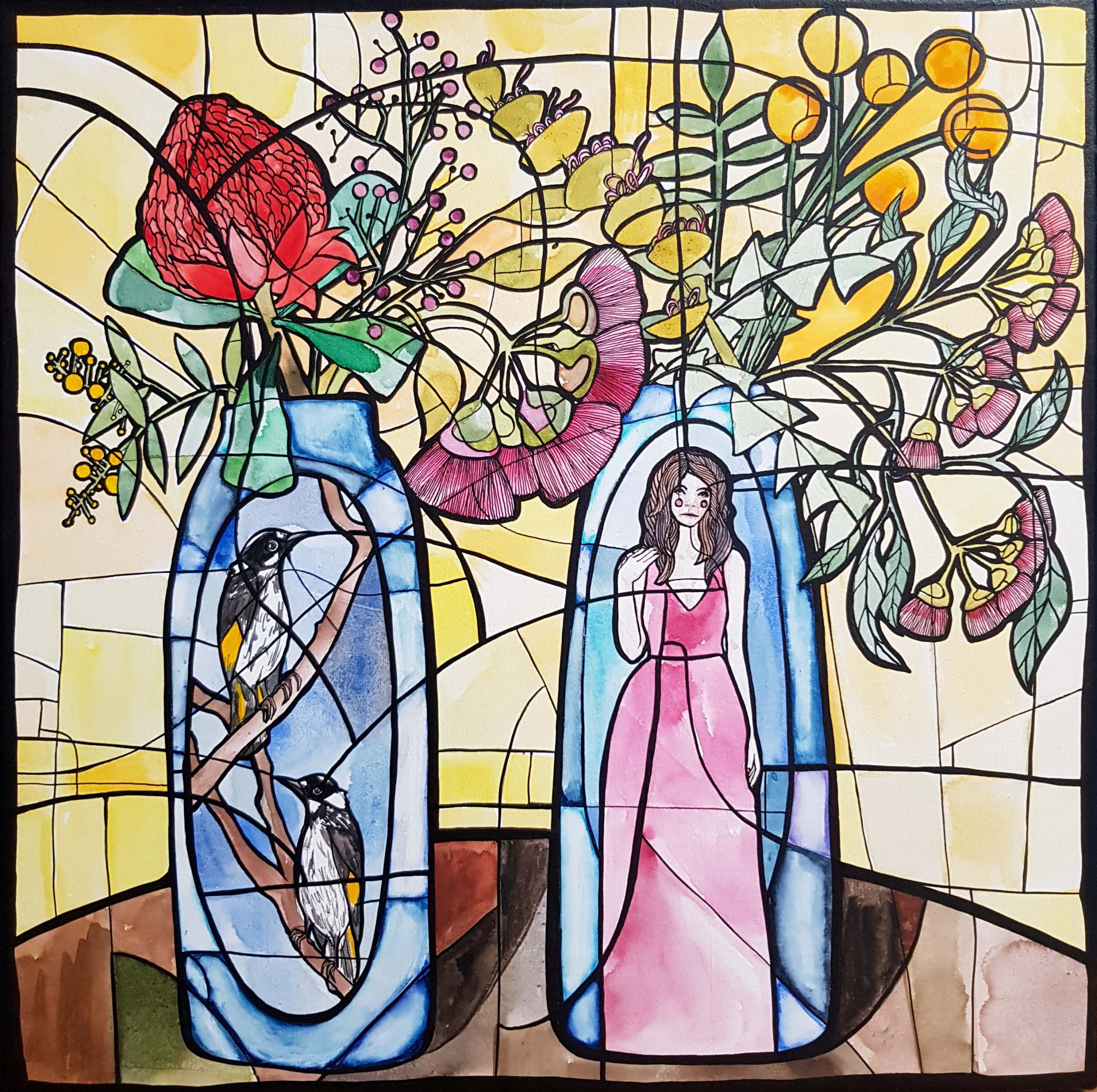 The Yellow Room by Nicola Cowie – This still life depicts two vases adorned with honeyeaters and a female figure and filled with Australia native flowers.