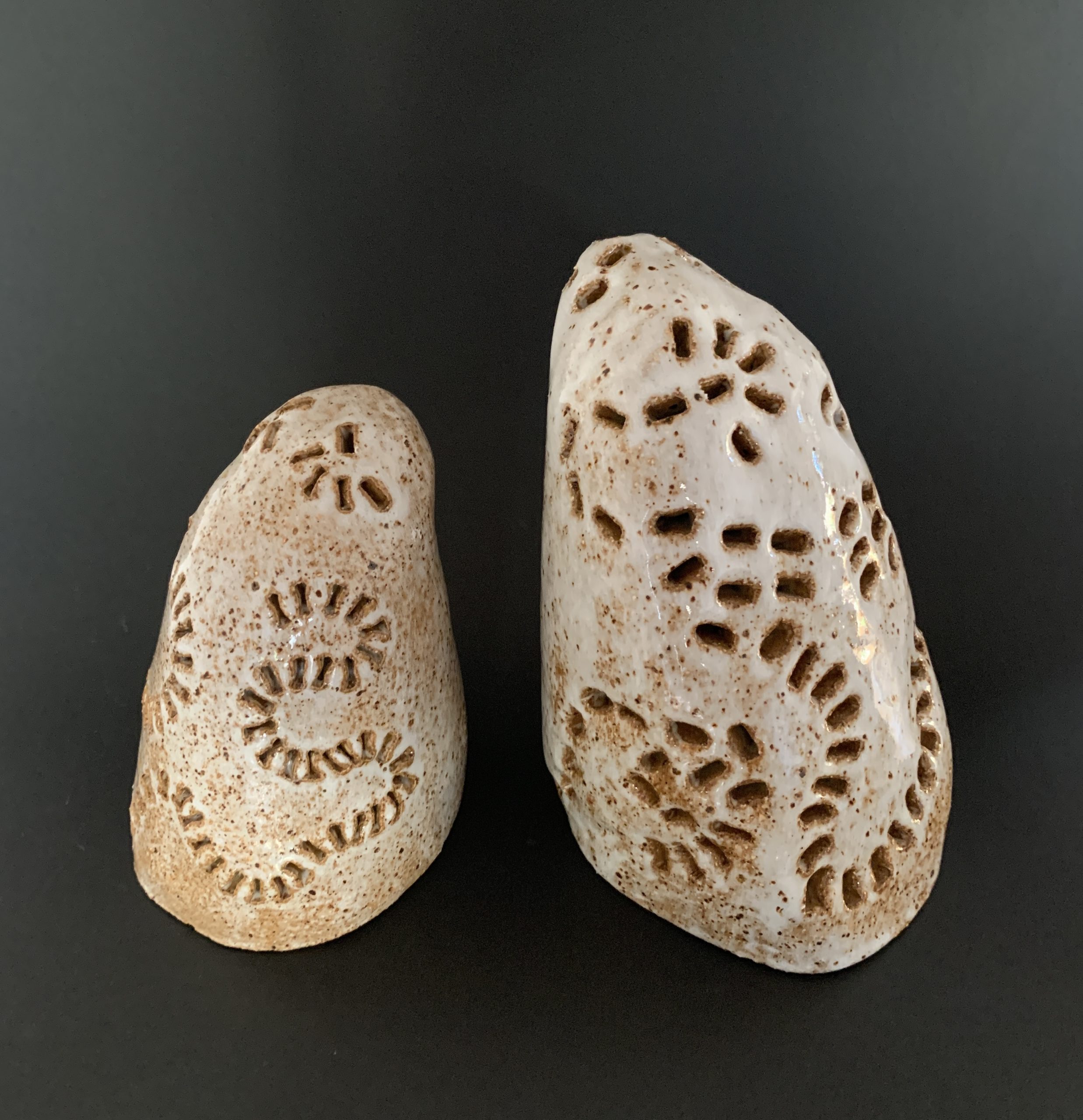 Hand built with white raku clay, bisque fired and glazed in a stone toned finish. Dimensions listed are averaged, individually – 10.5w x 15.5h x 1 d and 9w x 1 h x 8.5d cm.