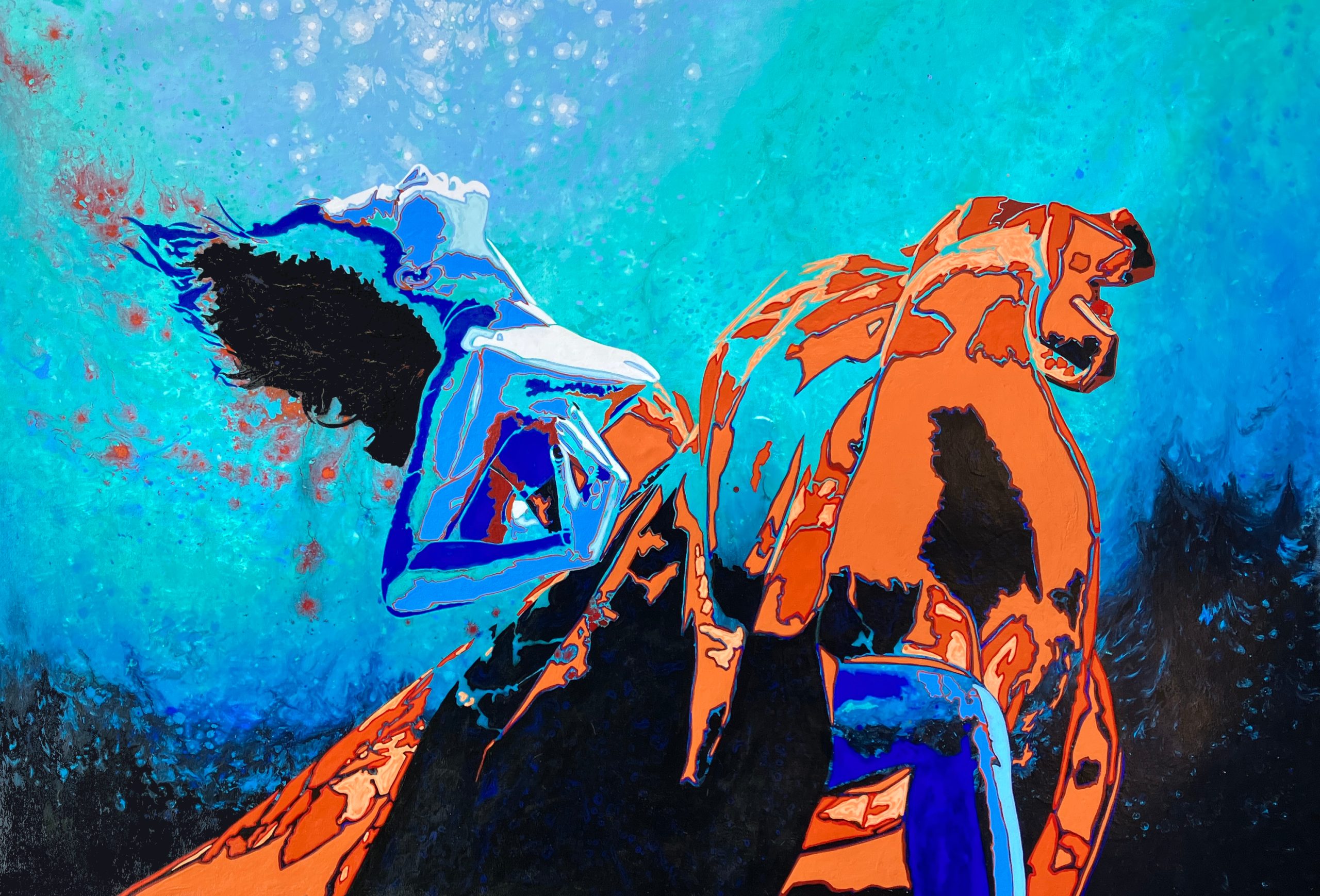 Kerry has used a contemporary approach using techniques such as expressionism and pop art to capture her model in contrasting colours of caramel teal and blue. In this rectangular composition of an underwater world, the light highlights her face as she rises to the surface.