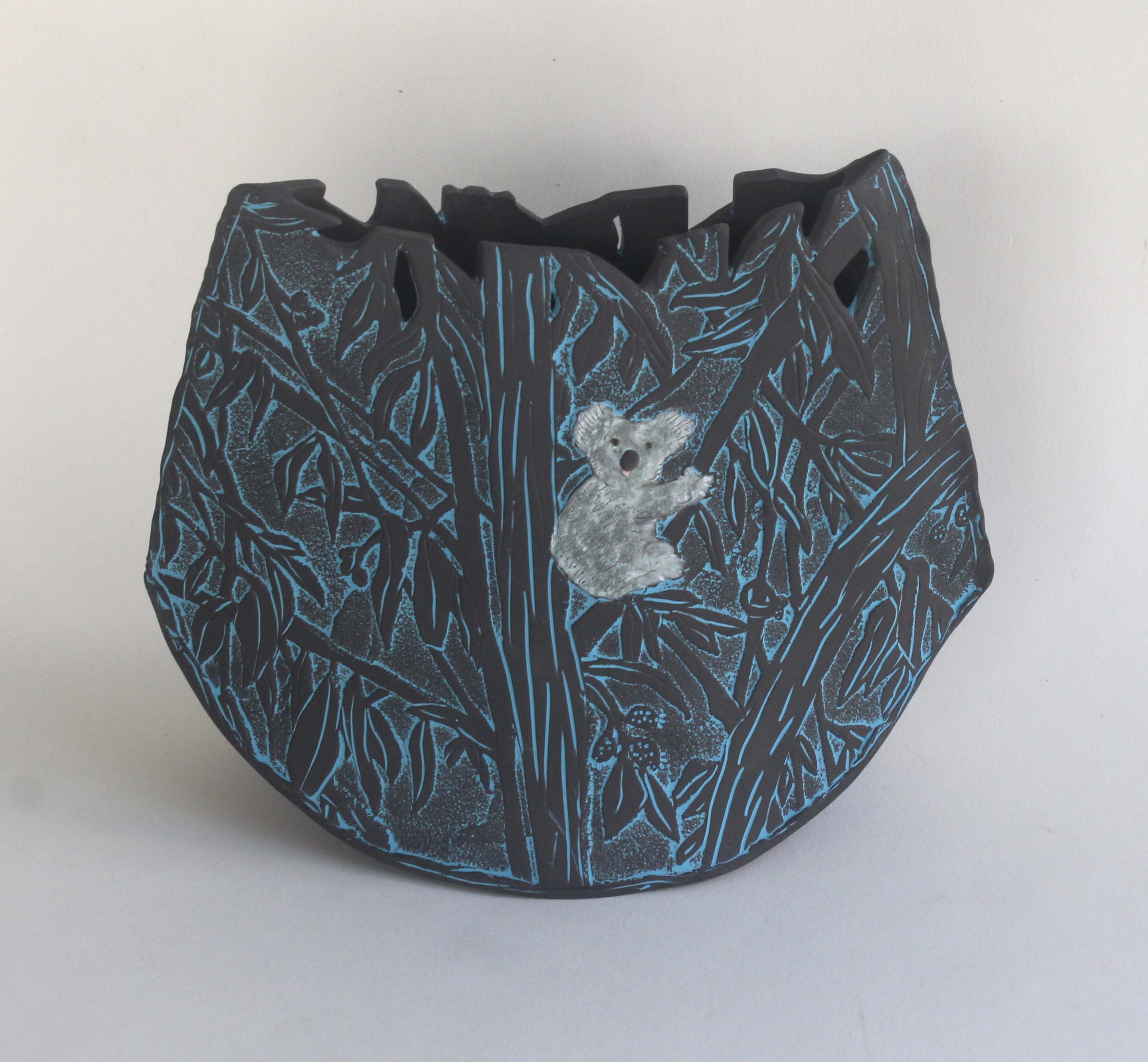 Lizzy is the resident Koala at my local Bushland Botanic Gardens.  I was inspired to make this piece after a recent walk and spotting Lizzy high up in a tree.  Technique forms an important aspect of my work with joy coming as much from the process as the finished piece.   My investigations into relief printed images and surface representations of flora and fauna, using clay as my expressive medium, is further explored.
