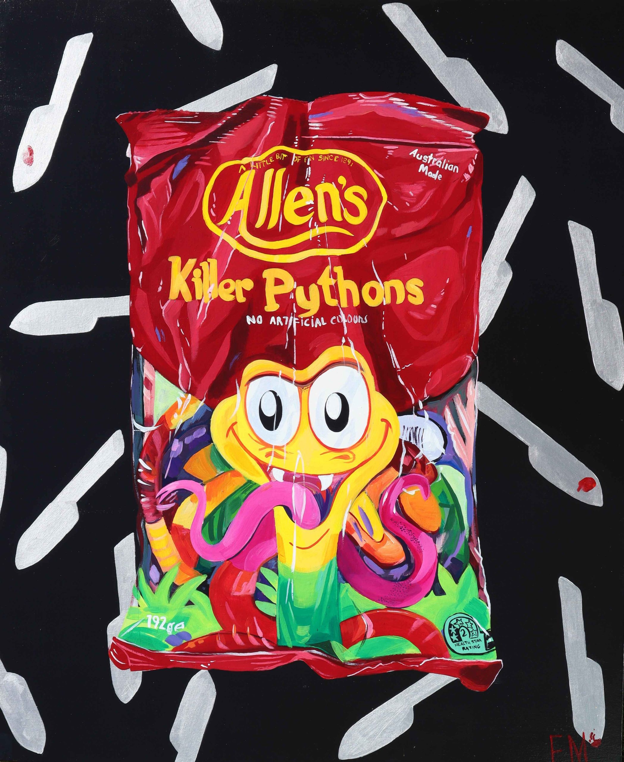 Killer Pythons had to feature in this playfully rebellious collection of paintings, against all health food advice I have indulged in extra large bags of lollies, lots of colour and plenty of pattern.