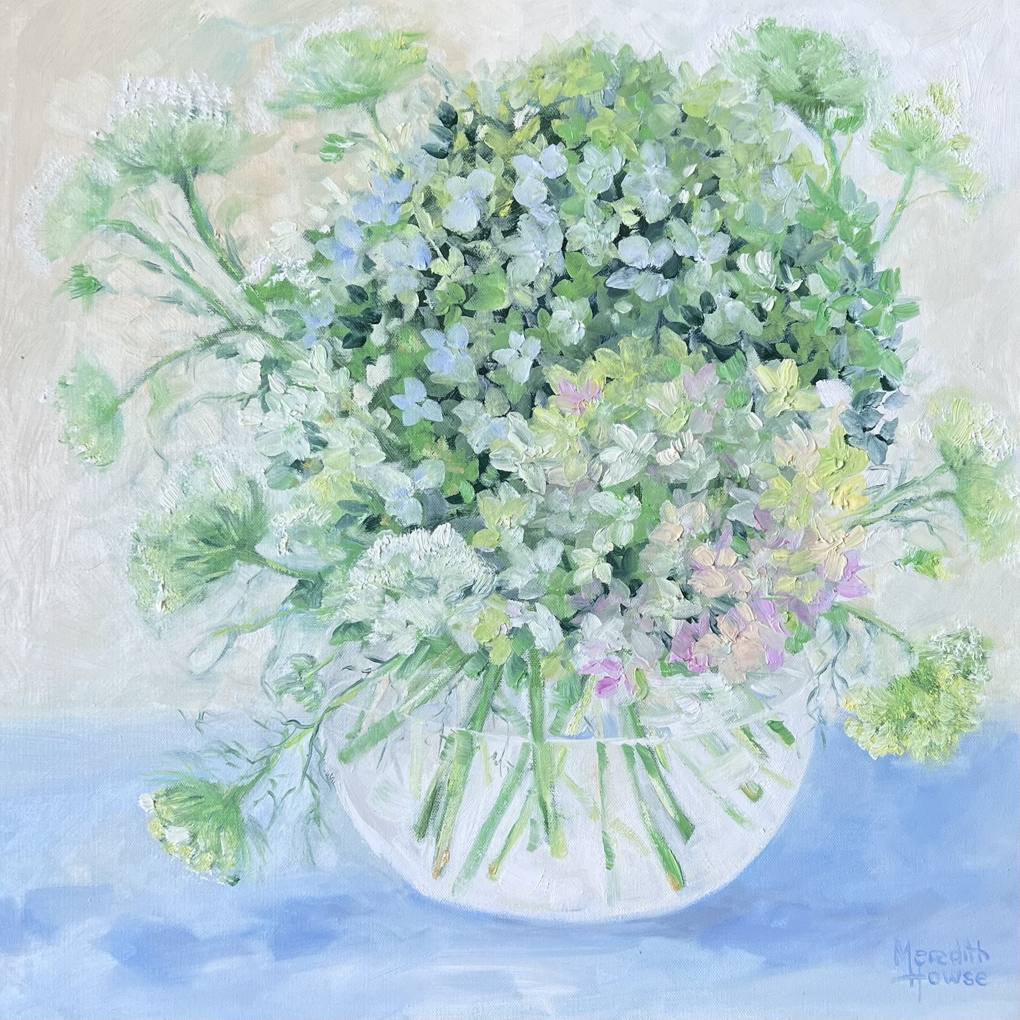 Thinking of You by Meredith Howse captures the delicate beauty of fresh Hydrangea flowers in a glass vase. The painting features a range of soft and subtle colours, including light mint greens and pinks, with a pale yellow and light blue background that adds a touch of elegance and sophistication to the artwork. The glass vase is subtlety rendered, capturing refractions of light as it passes through the clear material.