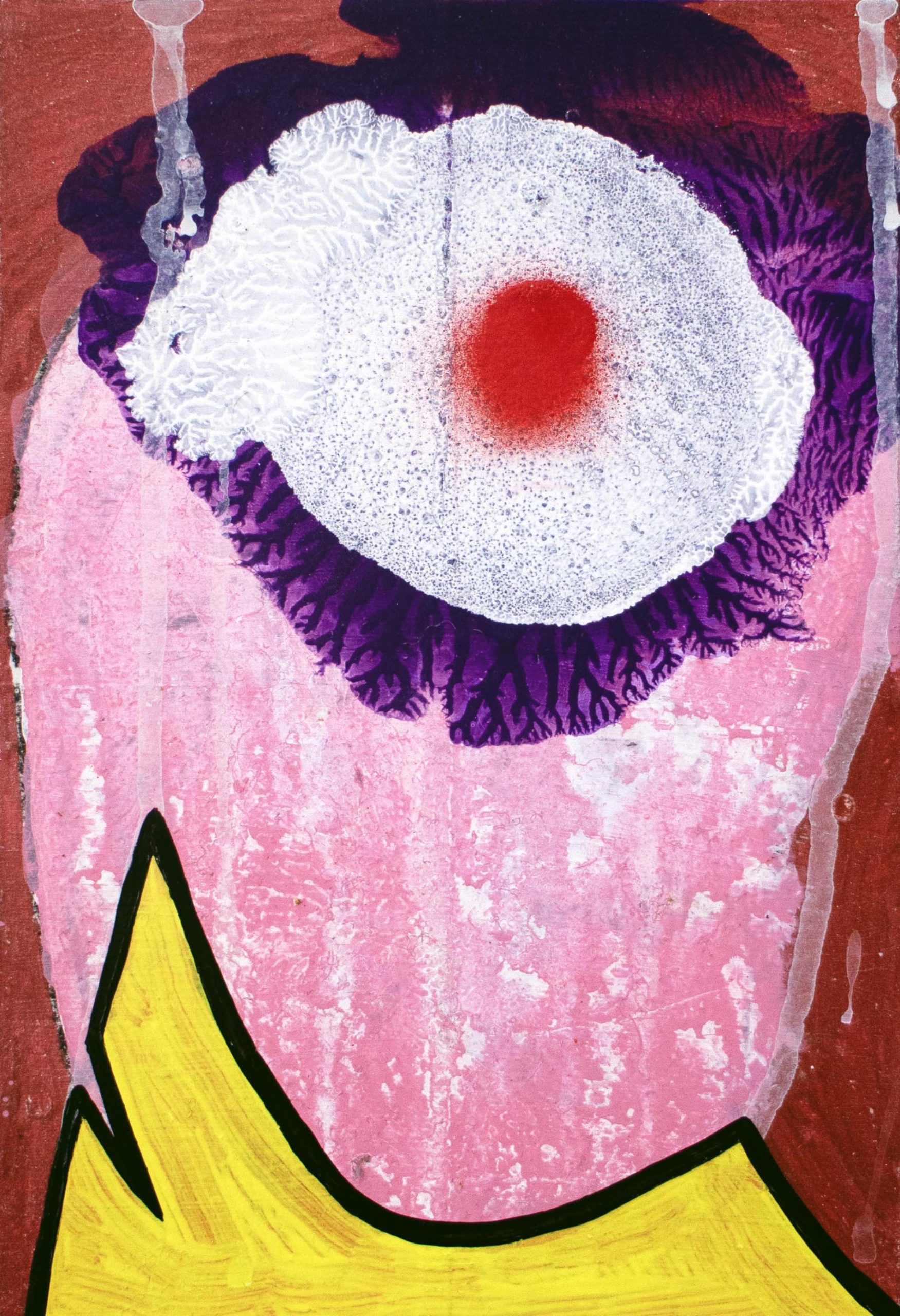 Acrylic, spray paint and collage mounted on card