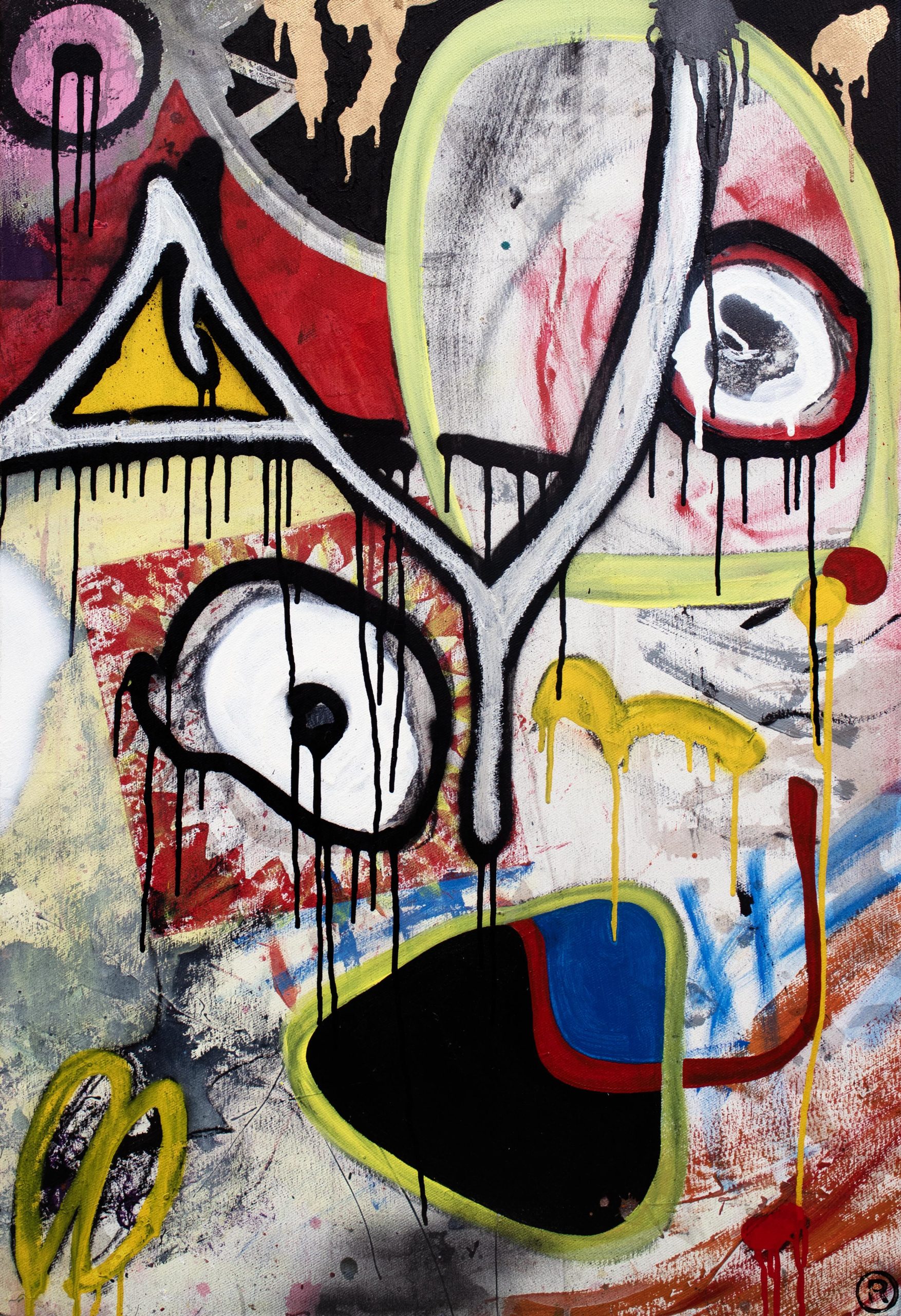 Acrylic, spray paint, oil stick, and charcoal on canvas