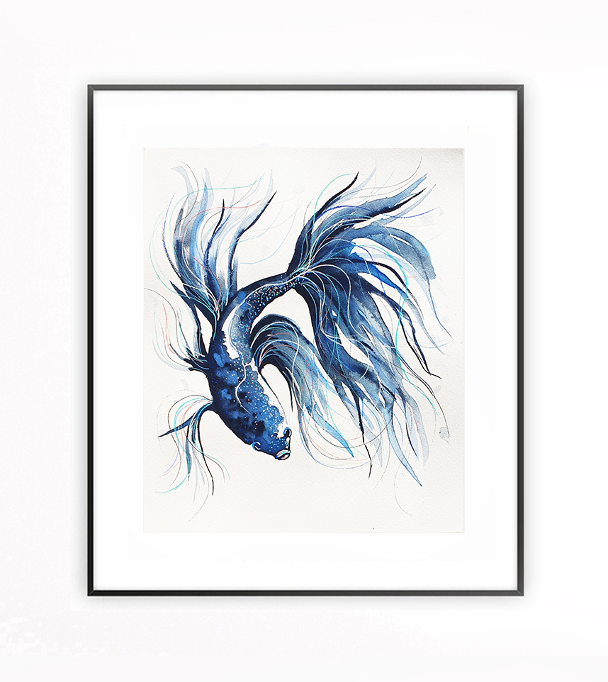 This Blue Betta Fish – A beautiful indigo blue Betta fish (Siamese fighting fish) painting by Sydney artist Leni Kae. It symbolizes a spirit of individuality, strength, and a freedom of spirit. Loose linework is used to capture movement and a sense of freedom. The use of indigo tones symbolises spiritual tranquility and awareness. An affordable small art piece to start your collection, or unique art gift for fish lovers.
