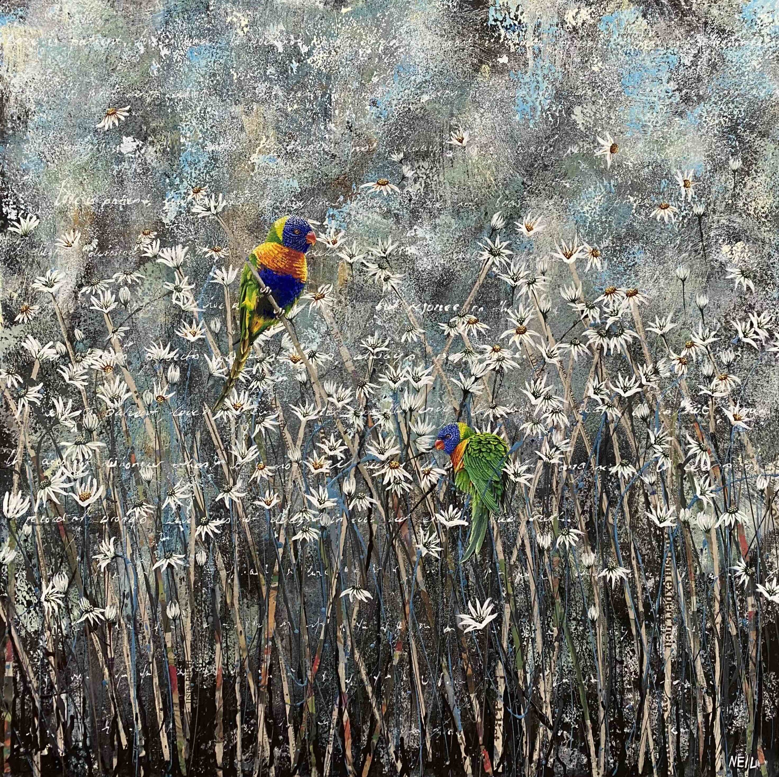 This painting subtly contains the bible passage: Love is patient, love is kind. It does not envy, it does not boast, it is not proud. It does not dishonour others, it is not self-seeking, it is not easily angered, it keeps no record of wrongs. Love does not delight in evil but rejoices with the truth. It always protects, always trusts, always hopes, always perseveres.