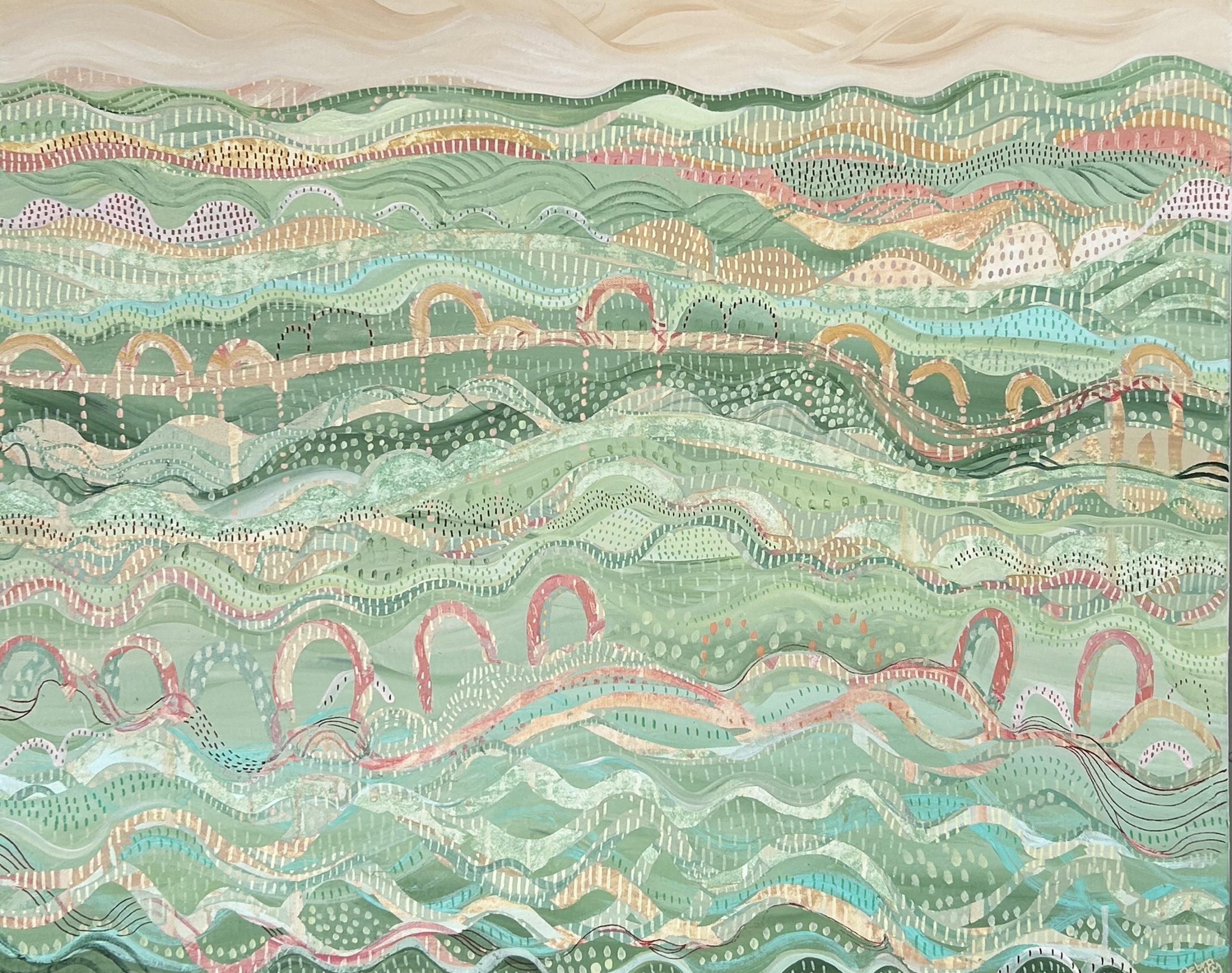 This artwork is an abstract style landscape using the contrasting textures and patterns of acrylic paint and artist markers. I am inspired by the patterns of earth, water and sky and ‘This Woven Earth’ is a harmonious artwork using many layers that I weaved throughout, featuring earthy colours such as rusty red, clay, green, dusty pinks, ochre and pale blue, and hues of green while using organic flowing shapes and patterns that reflect the varied natural and raw elements found in the landscape.