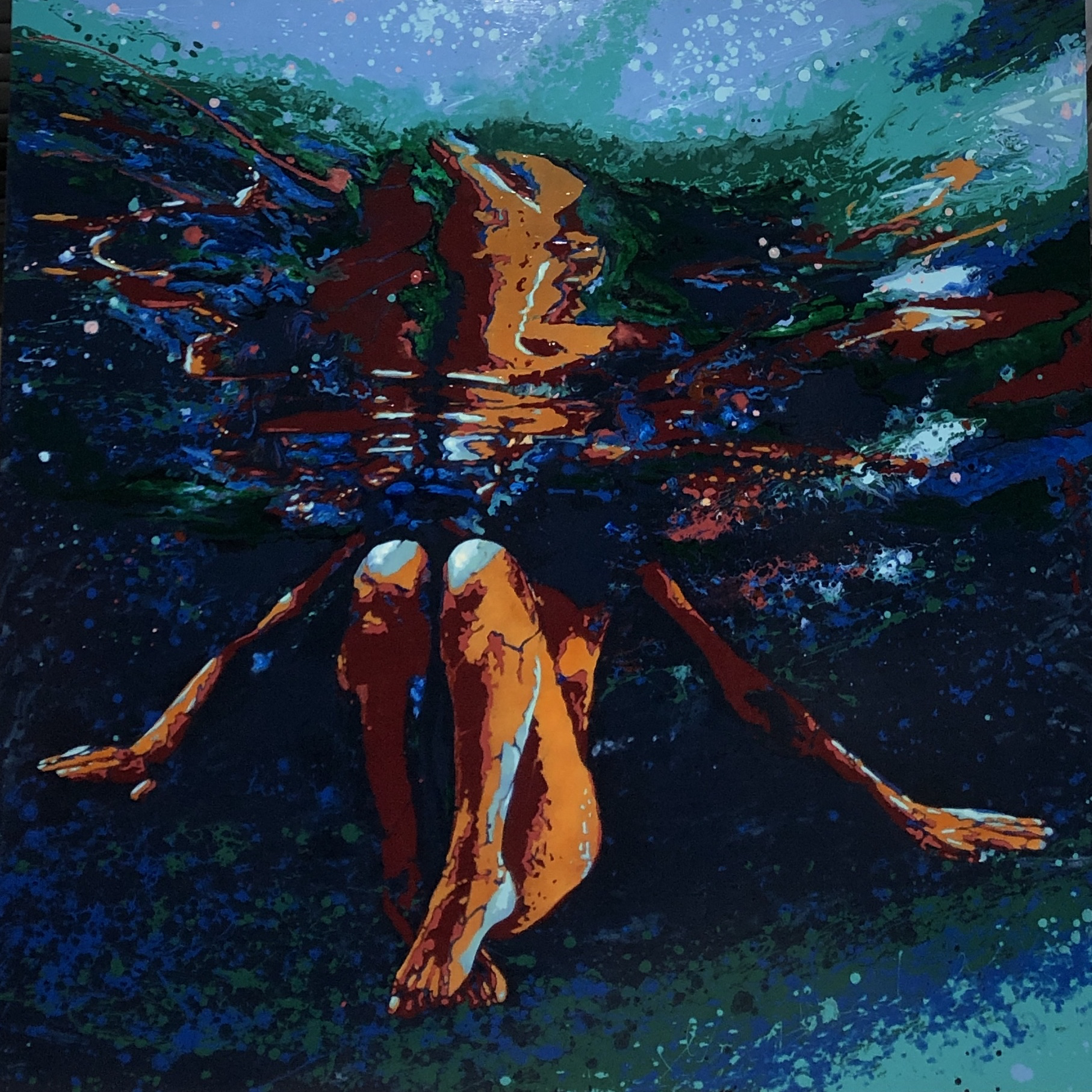 Working from manipulated photographs and film, my current body of work is inspired by the female form in water. Using contemporary paint applications, and wet in wet painting techniques, I capture the fluidity and movement of water. Contemporary stencilling techniques from pop art influences place the figure in the foreground of my expressionistic backgrounds. This underwater habitat is refreshing and liberating, creating a sense of suspension and quietness.