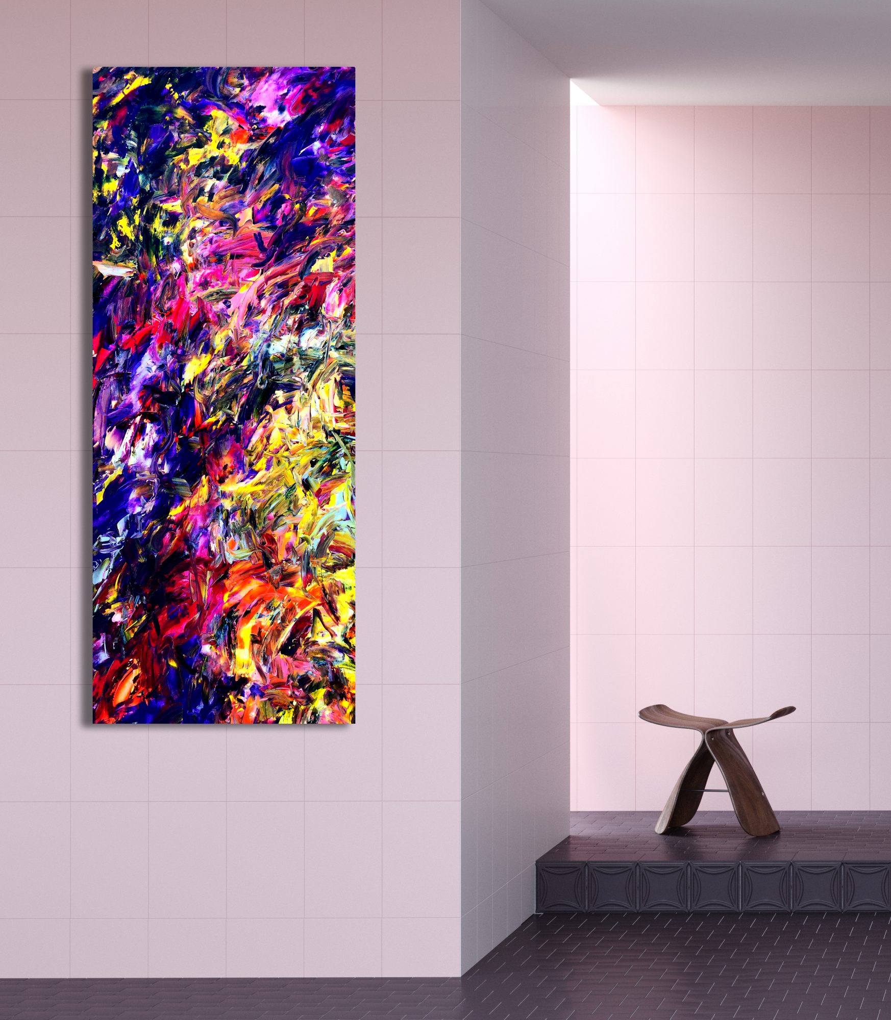 This work is painted on 12 oz gallery canvas and has been sealed with varnish. The canvas is hand-stretched onto a frame is 60 cm in width by 150 cm in height.