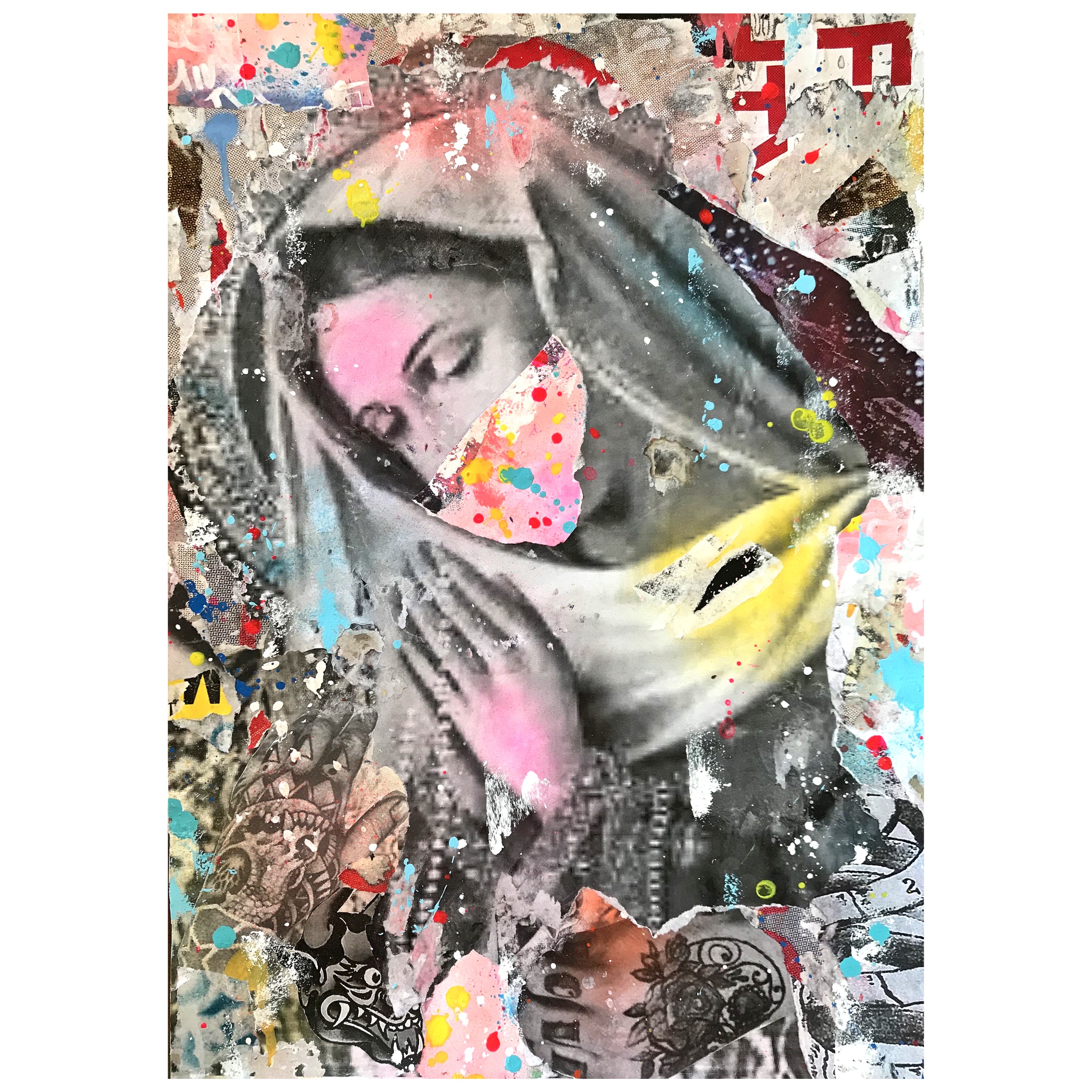 Then the main Image of a the The Virgin Mary was then added and further overlaid with a recycled paper and paint to give the image a worn rustic appearance, and then given the most essential fashion accessory in the modern world, a face mask.