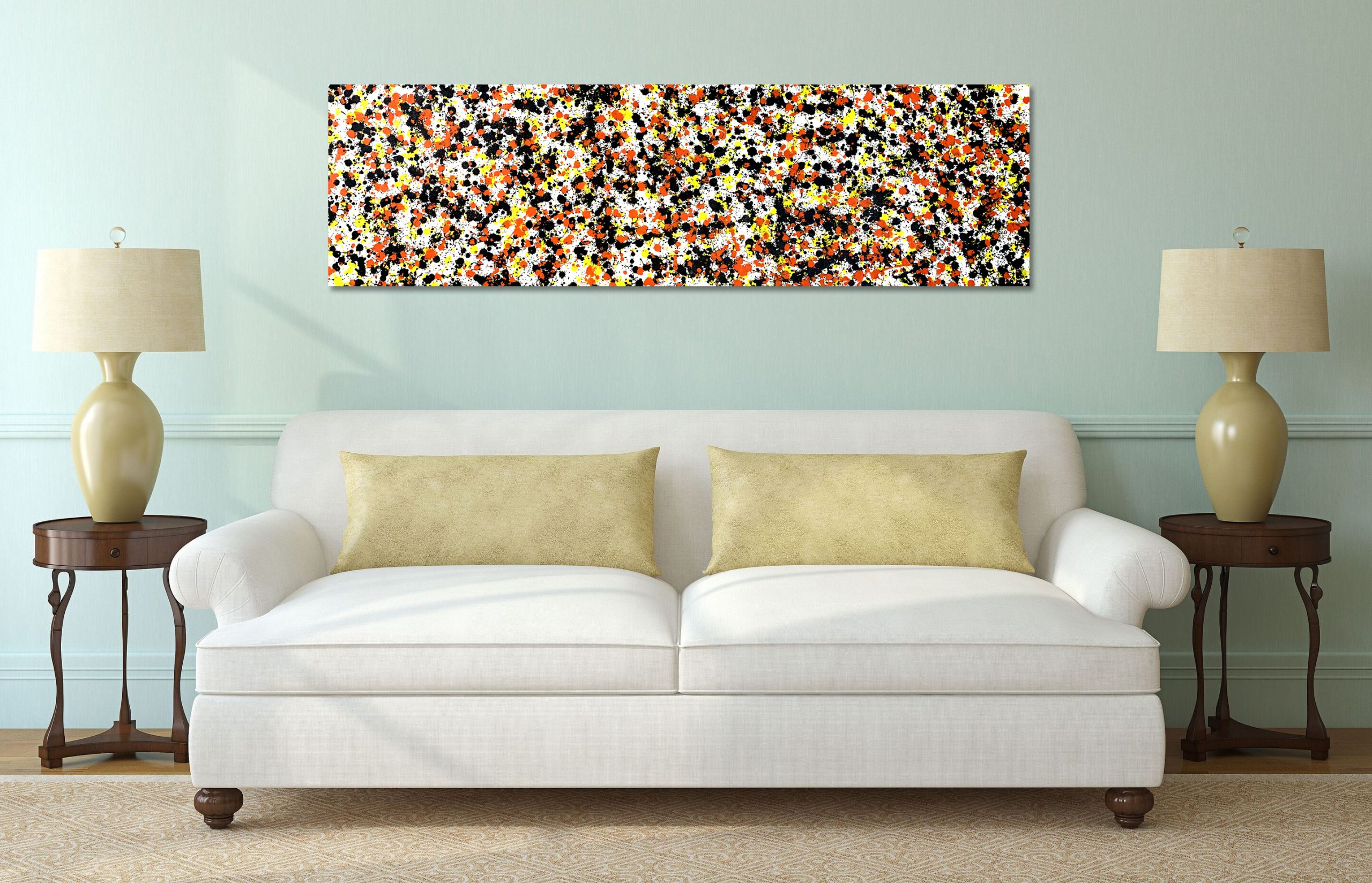 This canvas is 174 cm (W) x 50 cm (H), 4 cm (D). The sides are painted in the same manner so no frame is required. The painting was created with Synthetic Polymer on a professional stretcher. The artwork can be hugn vertically as well.