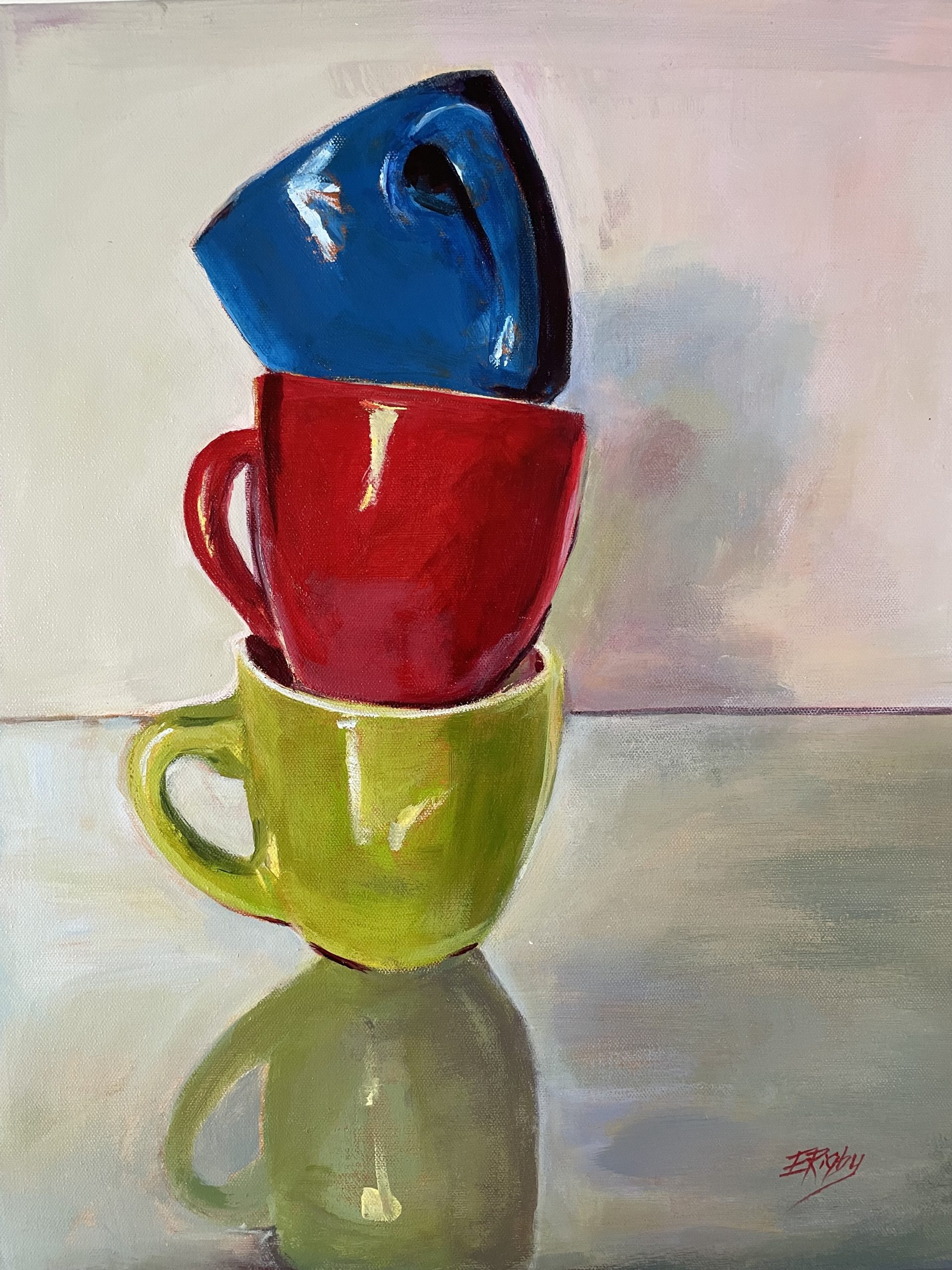 Three Cups by Eileen Rigby – I have a collection of cups and amongst them are several tiny ones that I love. (for Piccolo coffee) This artwork depicts a three stack of my favourite ones. Every subject that I paint comes from my studio or from personal life’s experiences – a little bit of me in every painting! Atelier professional paints and varnished.