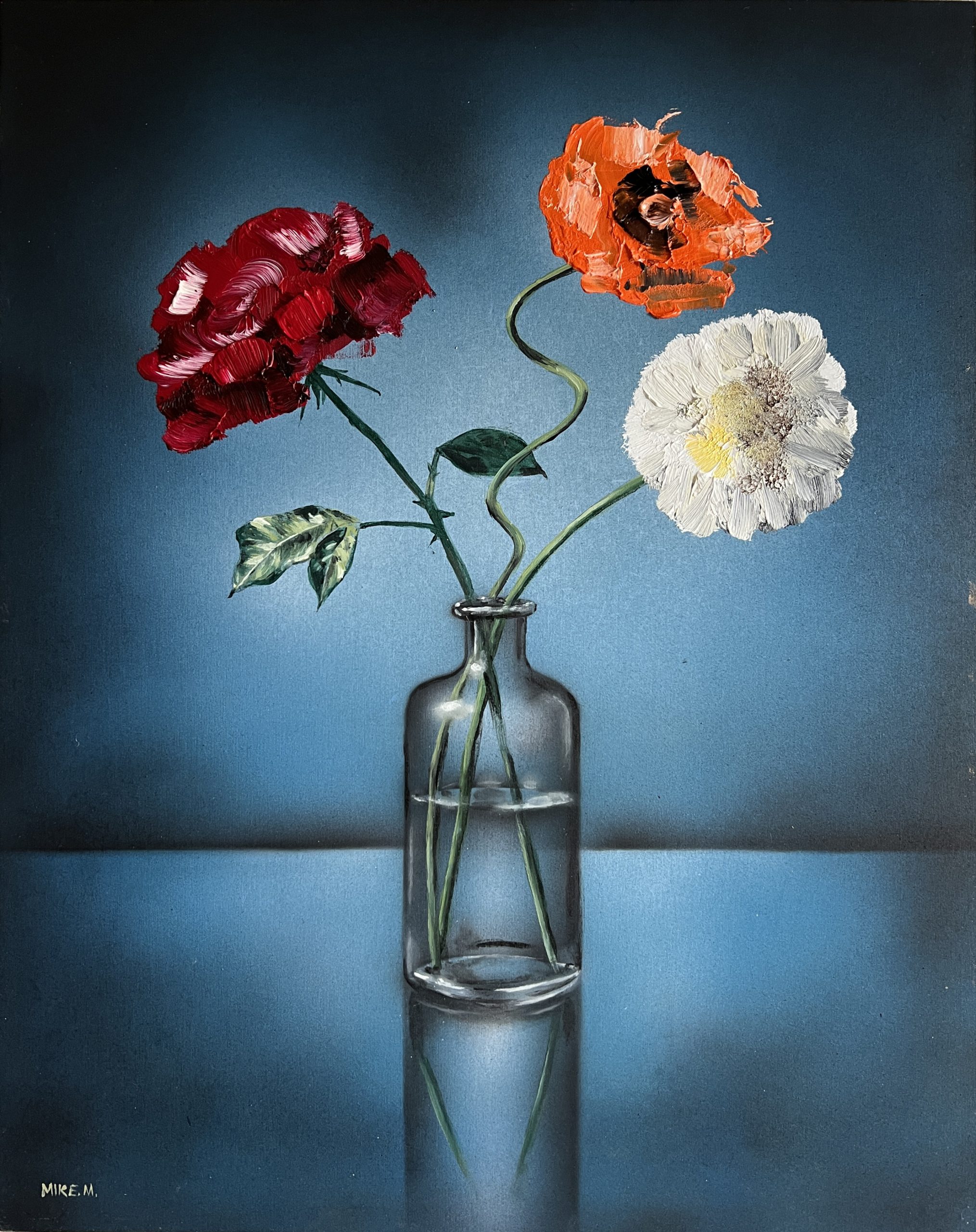 Part of a series of contemporary still‑life works in McHugh’s signature high‑contrast, high‑impact style, this piece features a deep, velvety blue backdrop created through a blend of airbrush and oil techniques. Soft, deliberate highlights illuminate three abstracted blooms—a rose, a poppy, and a large dahlia—balancing realism and abstraction. The result is a harmonious fusion of airbrush precision and traditional painterly expression.