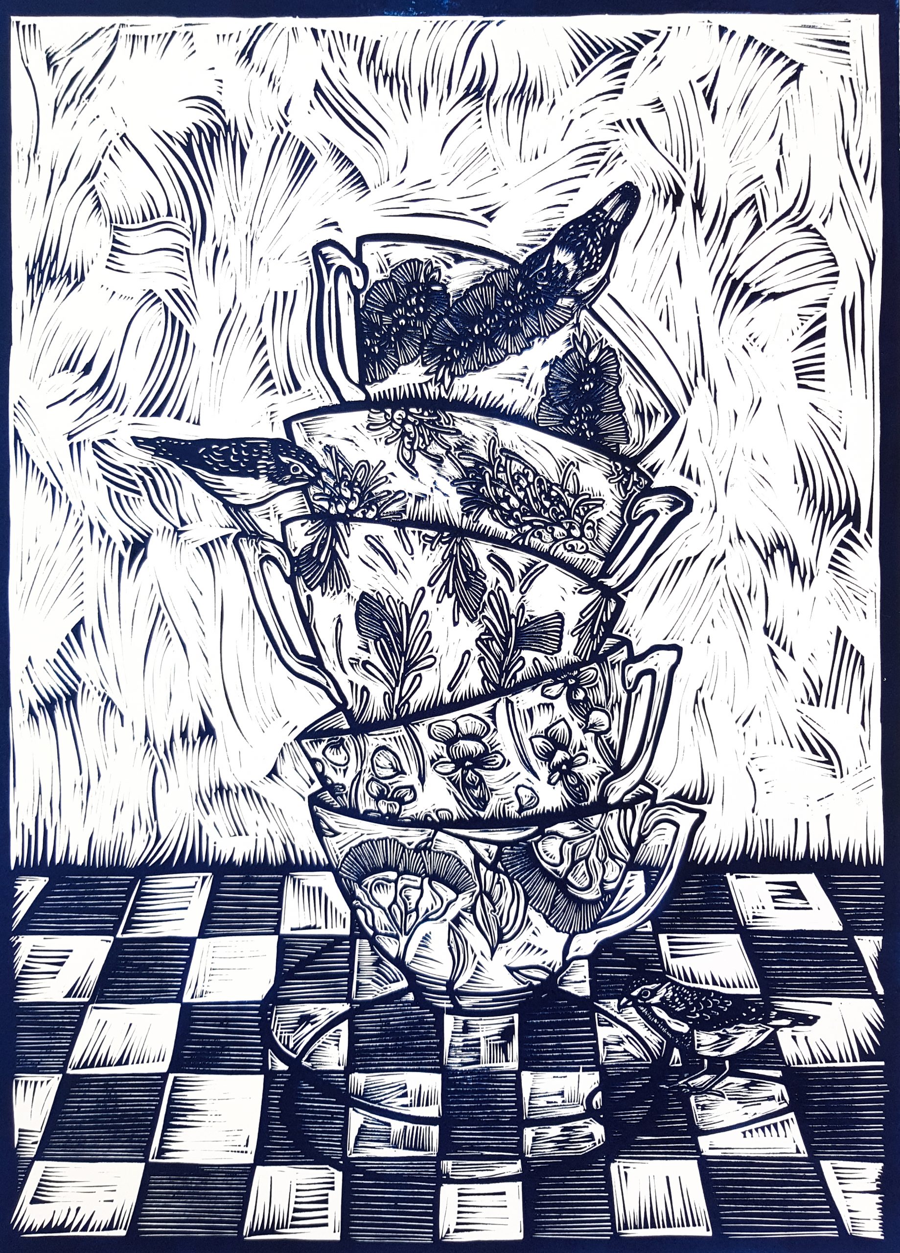 With three sweet spotted pardalote bird and a stack of teacups adorned with Australian native flowers it is a whimsical artwork with intricately carved details which retain lots of the carved areas unique to relief printmaking.