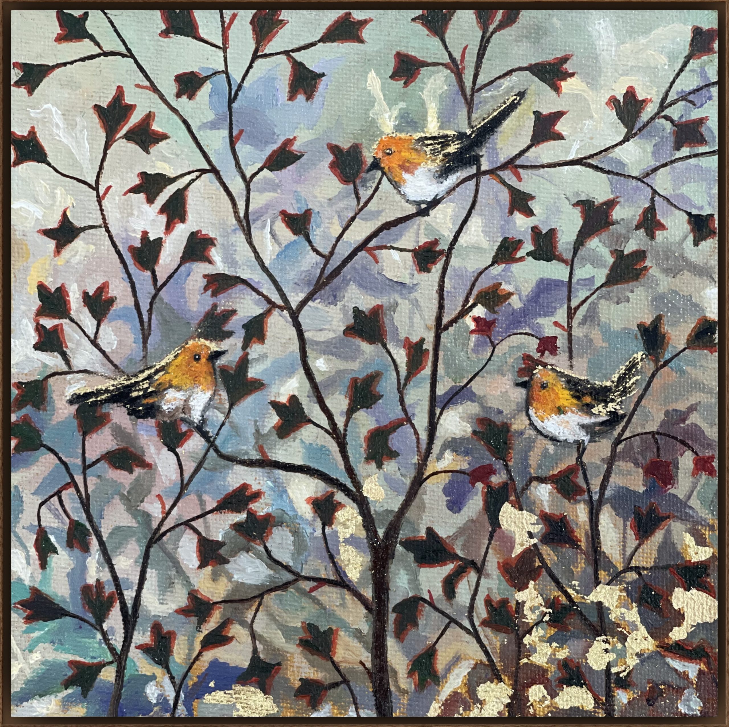 Original Abstract of robins in oil and touch of gold leaf on canvas panel