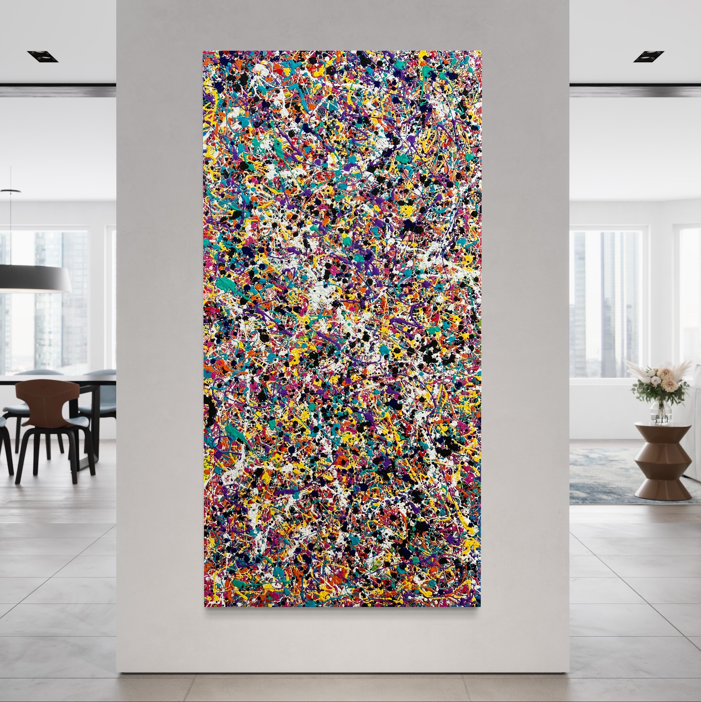 Three O’clock by Jonathan Redmayne is a abstract expressionist style painting, created over a series of days adding one splash off colour at a time, A new series for 2023 titled “origins”.