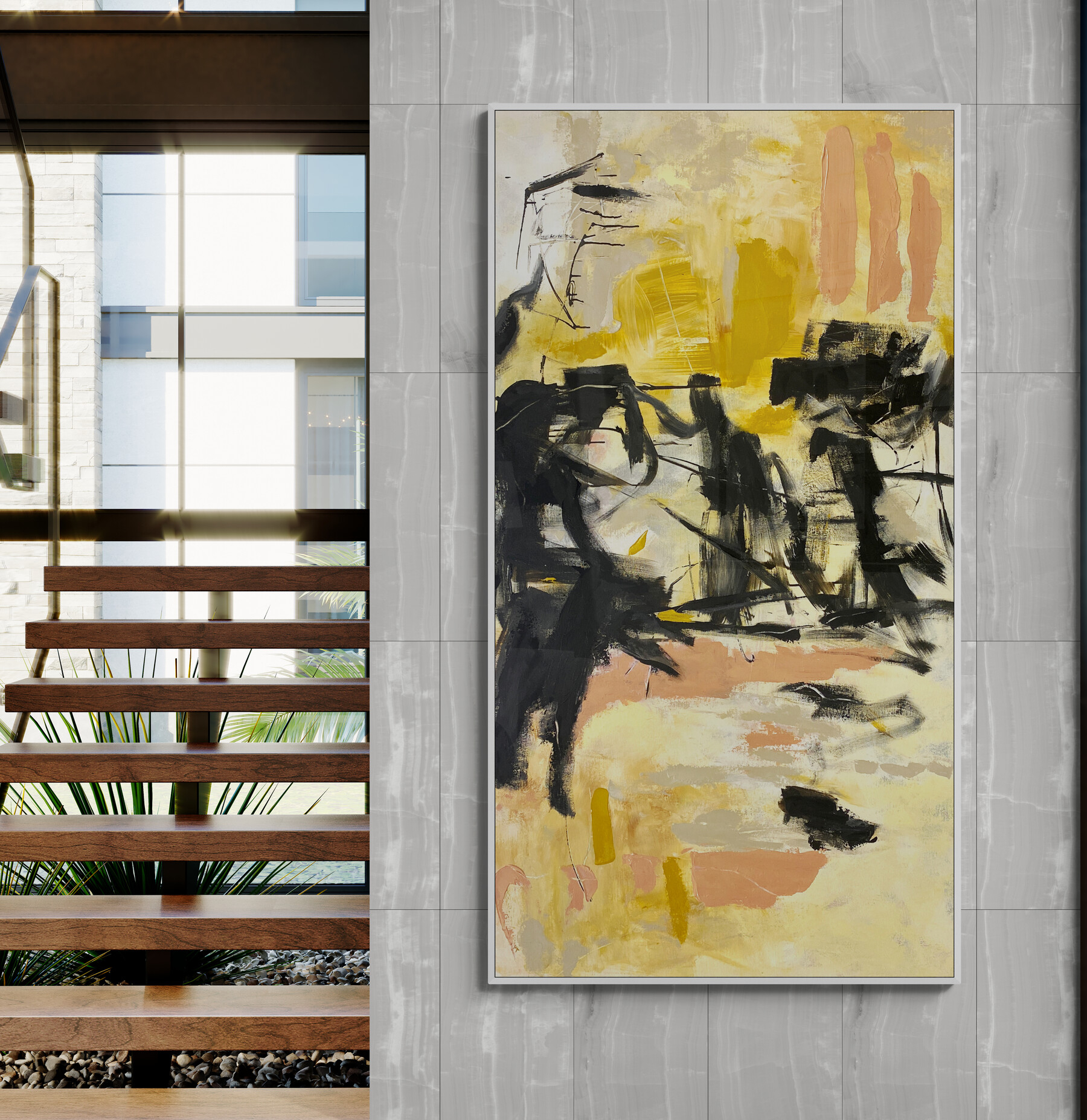 The fusion of texture and tonal colour within a restricted palette of yellow ochre, beige, lemon, peach, coral and browns set against areas of black white and grey.
