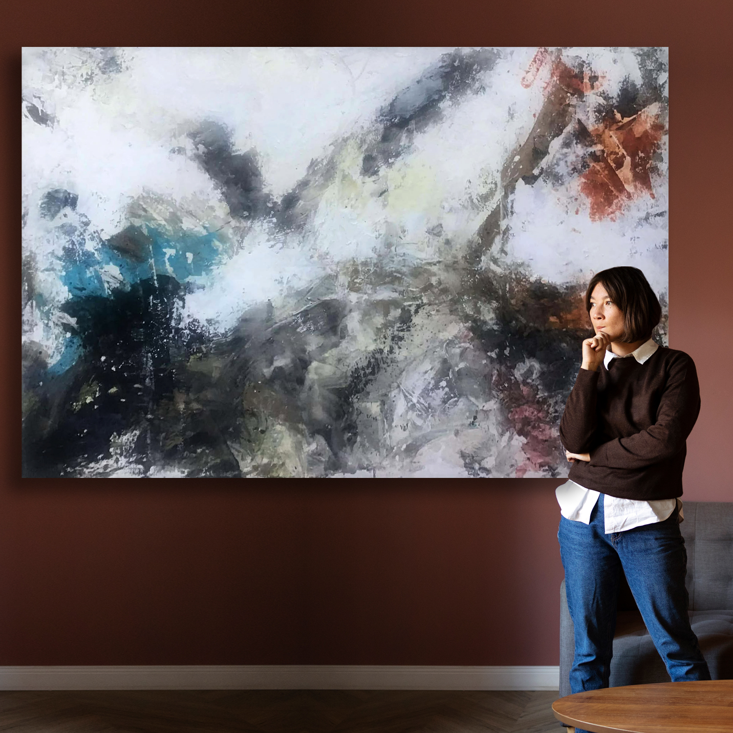 The artwork showcases an abstract style with a focus on texture and layering. The colour palette is dominated by whites, grays, and blacks, with hints of blue, teal, and a touch of orange. This limited palette creates a sense of muted drama, with the interplay of light and shadow being a key element. The composition is non-representational, relying on the interplay of shapes, textures, and colours to create visual interest. I hope you enjoy the dynamics and quiet intensity of this abstract piece.