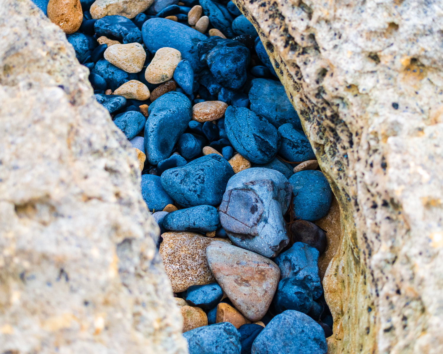 Bluestone pebbles gleam in the softened light.