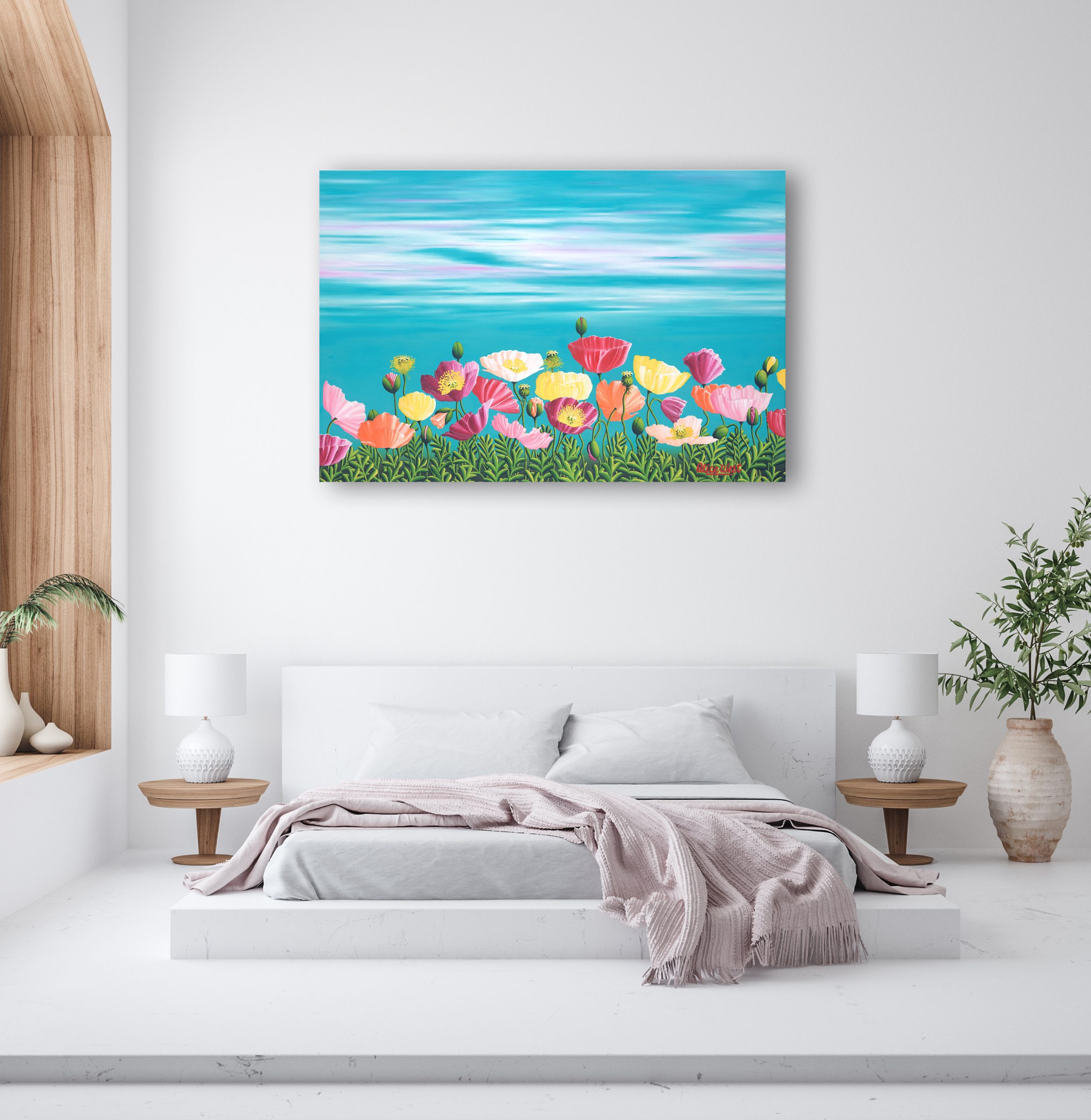 Through The Rainbow was created from my love of flowers and colour. There is something very special about poppies with their delicate wrinkled and slightly transparent petals and the beautiful array of colours. Each flower with its rustic shape and wobbly stem is unique and glorious. A unique painting that captures the essence of nature.