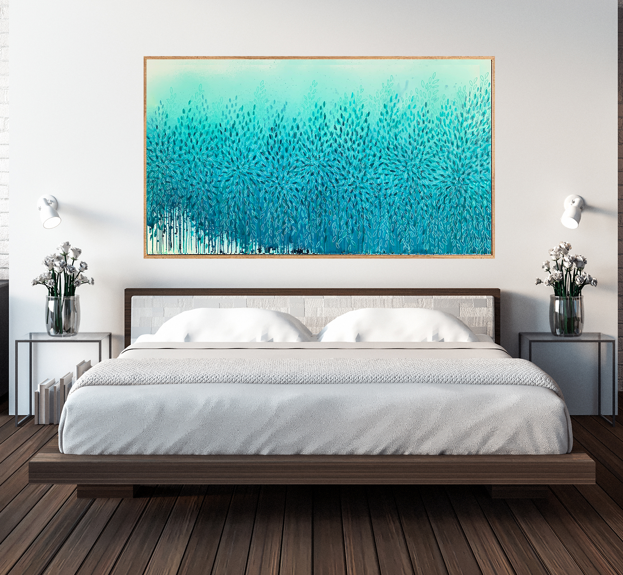 Through Truth and Trust, by Leni Kae – This teal and turquoise abstract landscape painting by Sydney artist Leni Kae represents opening up to inner truth and self-trust, and creating space for true “connection”; in turn allowing love and communication to flow openly without limits. Created with beautiful tones of teal, blue, turquoise and white, it makes a beautiful statement artwork for lounge room and bedroom interior design or interior styling. For bedrooms, this artwork is best suitable for a Queen Size bed dimensions (framed or unframed) or a King Size bed.